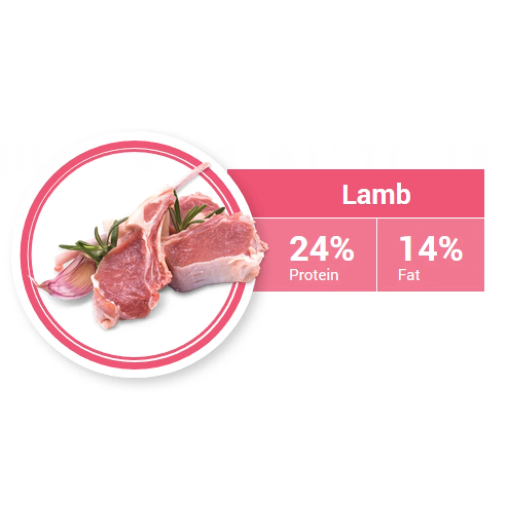 Αρνί γεύμα, γεύμα ρέγγα *, καστανό ρύζι, γλυκοπατάτα, περλέ κριθάρι, πλιγούρι βρώμης, λίπος κοτόπουλου (πηγή των ωμέγα-6 λιπαρά οξέα) φυσικά διατηρημένο με αναμειγμένες τοκοφερόλες, αποξηραμένος πολτός τεύτλου, αποξηραμένο οπό ντομάτας, κυτταρίνη σε σκόνη, ολόκληρο το λιναρόσπορο (μια πηγή των ωμέγα-3 λιπαρά οξέα), φυσική γεύση κοτόπουλου, φωσφορικό μονονάτριο, ρέγγα λάδι *, λεκιθίνη, προπιονικό ασβέστιο (σαν ένα συντηρητικό), χλωριούχο χολίνη, ανθρακικό ασβέστιο, εκχύλισμα ζύμης, θειικό σίδηρο, ασκορβικό οξύ (βιταμίνη C) , ταυρίνη, εκχύλισμα κιχωρίου (μια πηγή ινουλίνης), θειική γλυκοζαμίνη *, οξείδιο του ψευδαργύρου, οξικό άλφα-τοκοφερόλη (πηγή βιταμίνης Ε), θειική χονδροϊτίνη *, εκχύλισμα Yucca schidigera, L-κυστίνη, οξείδιο του μαγγανίου, το νικοτινικό οξύ, ϋ ασβεστίου που παντοθενικό, σεληνιώδες νάτριο, συμπλήρωμα βιταμίνης Α, χοληκαλσιφερόλη (πηγή βιταμίνης D3), νιτρική θειαμίνη, βιοτίνη, αποξηραμένα γεύμα φύκια, εκχύλισμα πράσινου τσαγιού, αποξηραμένα δυόσμο, μαϊντανό αποξηραμένα, αποξηραμένα τζίντζερ, πρωτεϊνικός ψευδάργυρος, ριβοφλαβίνη, υδροχλωρική πυριδοξίνη, συμπλήρωμα βιταμίνης Β12, ιωδικό ασβέστιο, ανθρακικό κοβάλτιο, μαγγάνιο πρωτεϊνικός, πρωτεϊνικός χαλκός, φολικό οξύ.