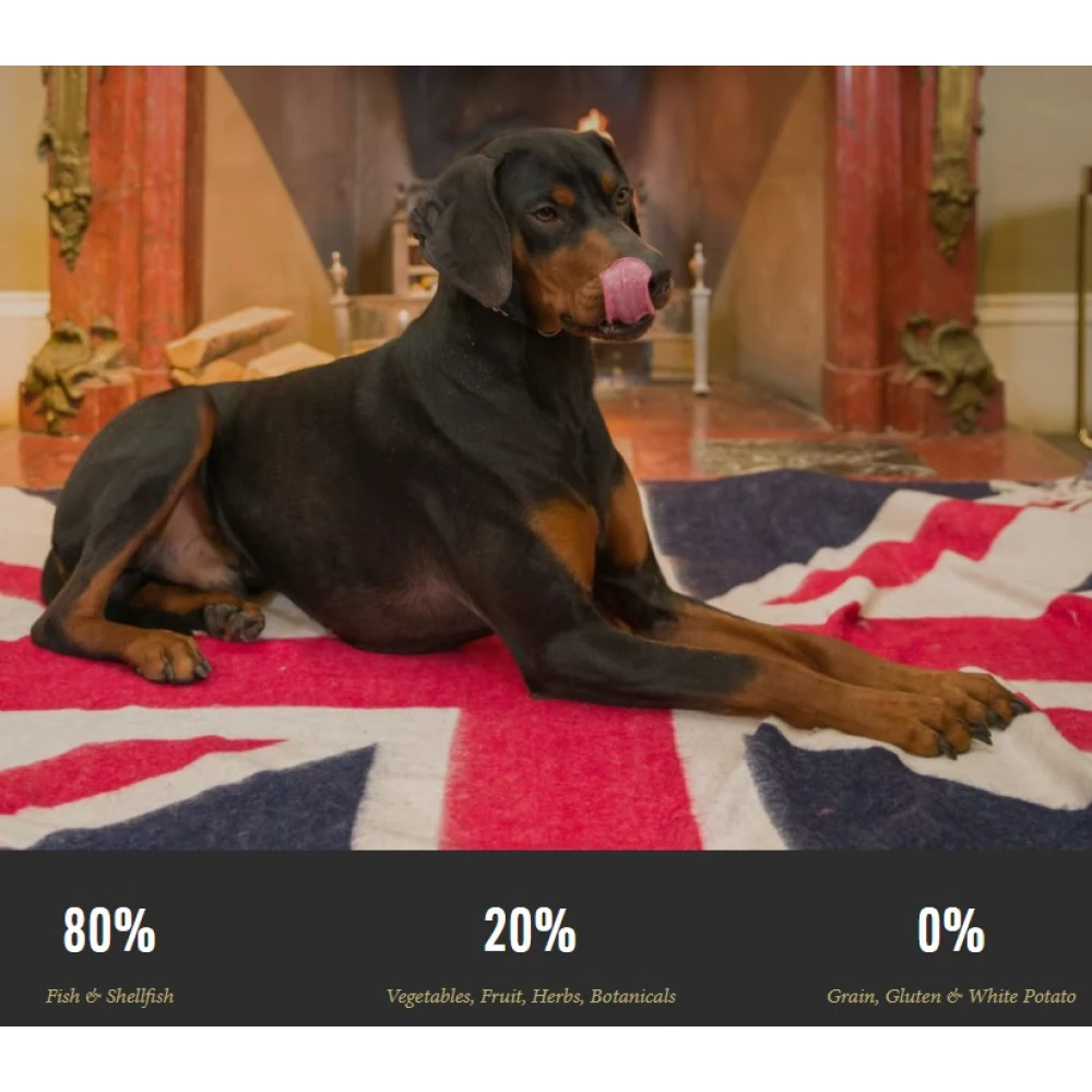 Σύνθεση: 80% ψάρια (περιλαμβάνει 44% σολομό, 29% αφυδατωμένη ρέγκα, 2% καραβίδα, 2% χτένια, 2% βούκινο, 1% ζωμός σολομού), γλυκοπατάτα, ρεβίθια, μπιζέλια, τριφύλλι, μεταλλικά στοιχεία, βιταμίνες, ταπιόκα, μήλο, κράνμπερι, αχλάδι, μύρτιλλο, βατόμουρο, πορτοκάλι, μαύρο μύρτιλλο, κόκκινο μύρτιλλο, καρότο, ντομάτα, ραδίκι, δυόσμος, μαϊντανός, κανέλα, καλεντούλα, τσουκνίδα, χαμομήλι, κυνόροδο, γιούκα, σπιρουλίνα, φύκια, γλυκάνισο, μοσχοσίταρο, ρίγανη, φασκόμηλο, μαντζουράνα, θυμάρι (γλυκοζαμίνη 178mg/kg, MSM 178mg/kg, χονδροϊτίνη 125mg/kg)