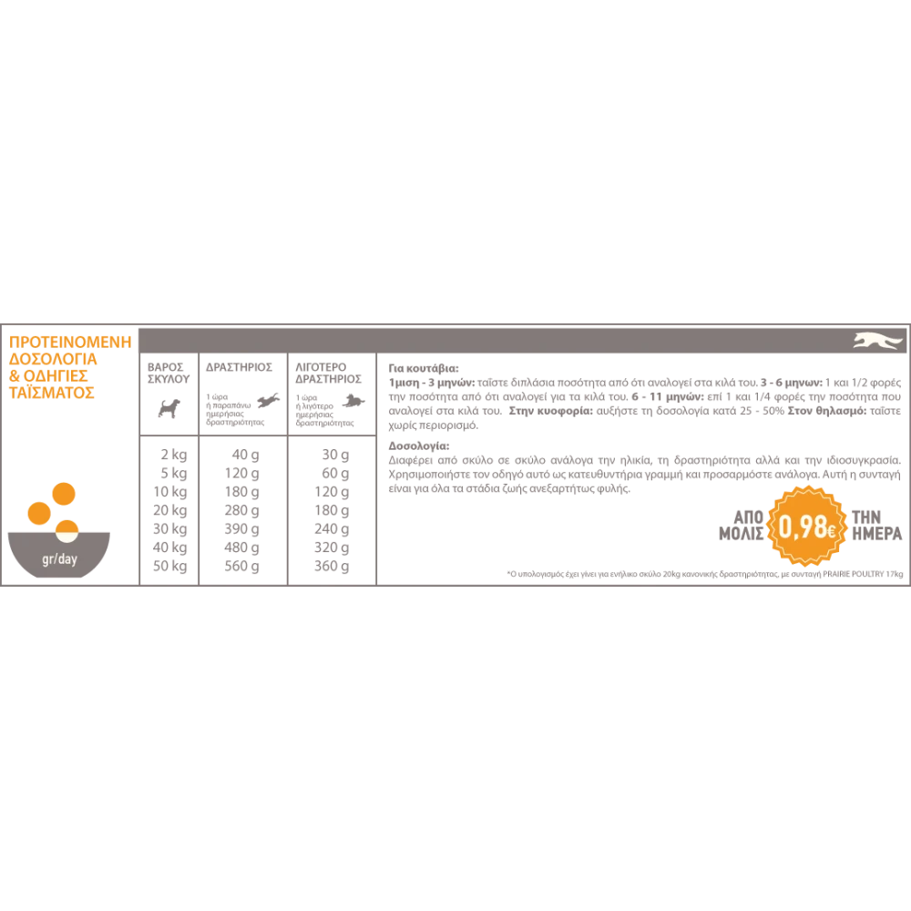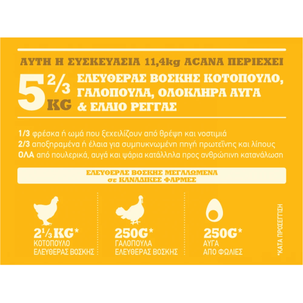 - Η ACANA Prairie Poultry υπερτερεί σε θρεπτική ζωική πρωτεΐνη και χαρακτηρίζεται από ελευθέρας βοσκής κοτόπουλο και γαλοπούλα, αλλά και ολόκληρα αυγά από φωλιές.