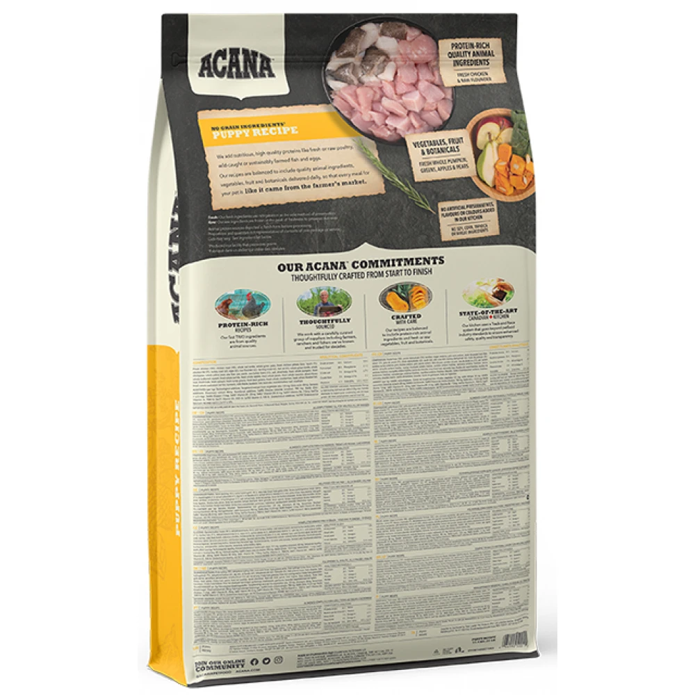 - Χωρίς σιτηρά και σύνθετους υδατάνθρακες όπως το ρύζι, η ταπιόκα ή η πατάτα, η ACANA Puppy είναι πλούσια σε ζωικές πρωτεΐνες για να προάγει την άριστη φυσική κατάσταση και την ανάπτυξη του κουταβιού σας.
