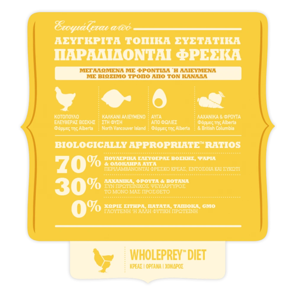ΣΥΣΤΑΤΙΚΑ: Φρέσκο Κοτόπουλο (18%), Αφυδατωμένο Κοτόπουλο (18%), Ολόκληρες Κόκκινες Φακές, Ολόκληρος Πράσινος Αρακάς, Φρέσκα Εντόσθια Κοτόπουλου (συκώτι, καρδιά) (7%), Λίπος Κοτόπουλου (7%), Αφυδατωμένη Γαλοπούλα (4%), Αυγά (4%), Ωμό Καλκάνι (4%), Αφυδατωμένη Ρέγγα(4%), Ιχθυέλαιο (3%), Ολόκληρες Πράσινες Φακές, Ολόκληρα Ρεβίθια, Ολόκληρος Κίτρινος Αρακάς, Ίνες Αρακά, Άμυλο Αρακά, Ωμό Συκώτι Γαλοπούλας (1%), Αλάτι, Αποξηραμένα Φύκια, Φρέσκια Ολόκληρη Κολοκύθα, Φρέσκια Ολόκληρη Κίτρινη Κολοκύθα, Φρέσκα Ολόκληρα Καρότα,ρέσκα Ολόκληρα Μήλα, Φρέσκα Ολόκληρα Αχλάδια, Φρέσκο Ολόκληρο Κολοκύθι, Αποξηραμένη Ρίζα Πικραλίδας, Φρέσκο Kale, Φρέσκο Σπανάκι, Φρέσκα Φύλλα Γογγυλιού, Φρέσκα Φύλλα Παντζαριού, Φρέσκα Ολόκληρα Κράνμπερι, Φρέσκα Ολόκληρα Μύρτιλα, Φρέσκα Ολόκληρα Μούρα Saskatoon, Κουρκουμάς, Γαϊδουράγκαθο, Ρίζα Λάππας, Λεβάντα, Ρίζα Μολόχας, Καρποί Τριανταφυλλιάς.