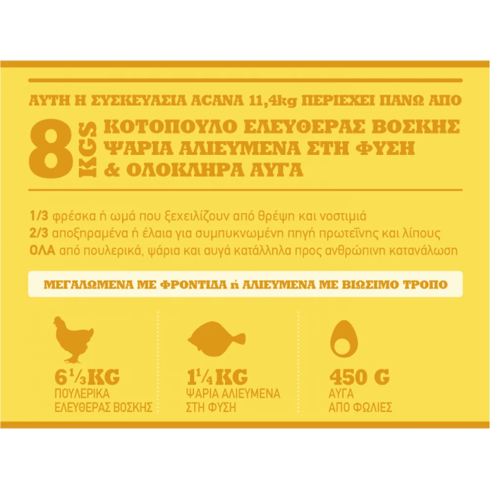 - H ACANA Puppy ξεχειλίζει από ελευθέρας βοσκής κοτόπουλο, αυγά από φωλιά από τα τοπικά αγροκτήματα και καλκάνι αλιευμένο στη φύση από το North Vancouver Island – ΟΛΑ παραδίδονται φρέσκα και παρέχουν βέλτιστη υγεία.