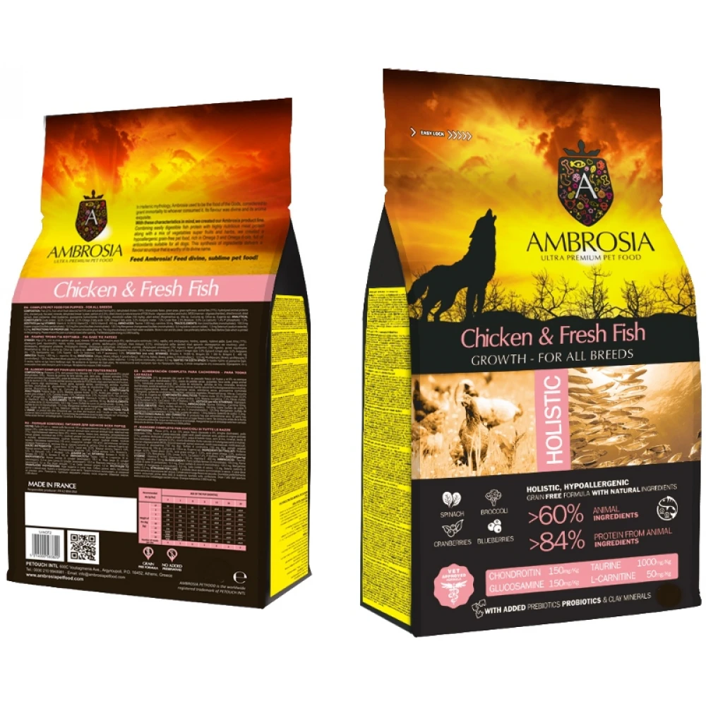 Η συνταγή Ambrosia Growth με κοτόπουλο και φρέσκο ψάρι συνδυάζει εύπεπτες πρωτεΐνες οι οποίες προέρχονται από φρέσκα ψάρια με πρωτεΐνες κοτόπουλου.