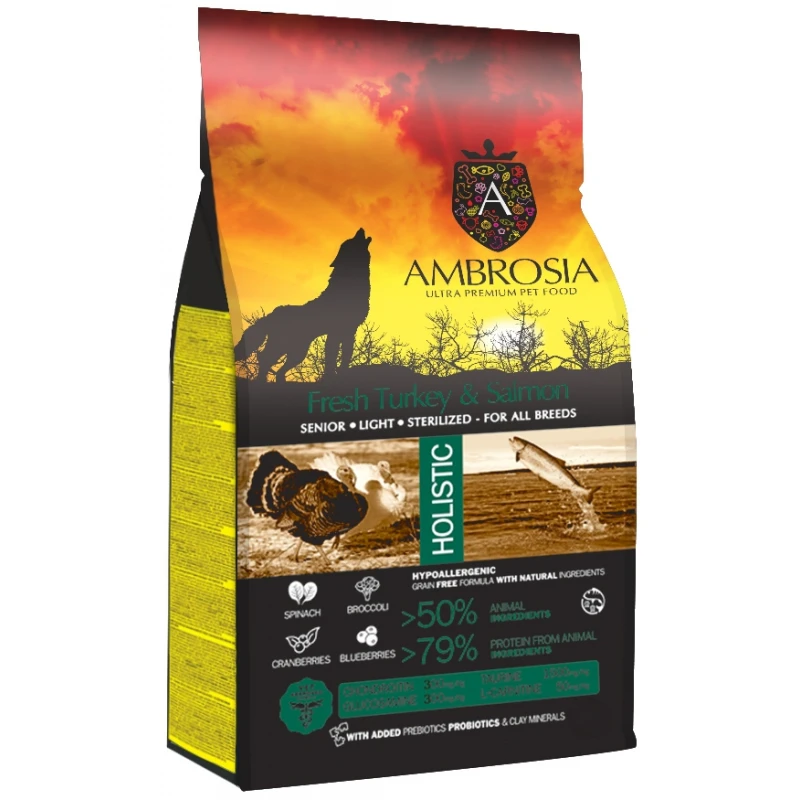 Ξηρή τροφή σκύλου Ambrosia Grain Free Dog Senior – Light – Sterilized Fresh Turkey & Salmon.Ολοκληρωμένη τροφή για υπερήλικους, υπέρβαρους και στειρωμένους σκύλους.