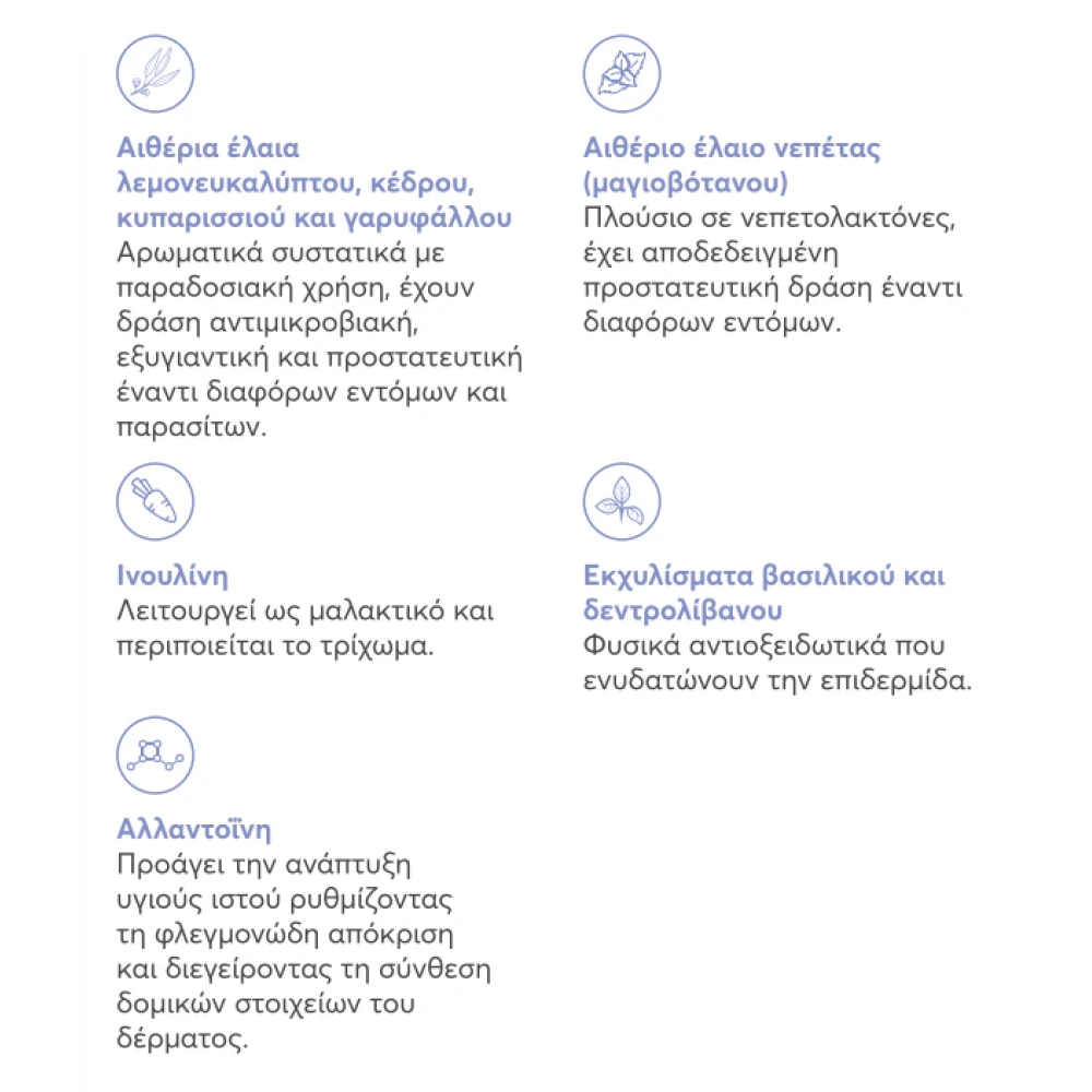 Απαλό αρωματικό σπρέι. Ένα μοναδικό μείγμα αιθέριων ελαίων που κρατά τα παράσιτα μακριά από την επιδερμίδα και το τρίχωμα του σκύλου.