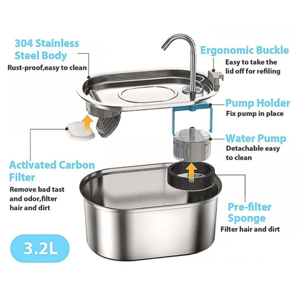 Αυτόματη Ποτίστρα Σιντριβάνι με Βρύση για Σκύλους και Γάτες Pet Interest από Ανοξείδωτο Ατσάλι 3,2L.