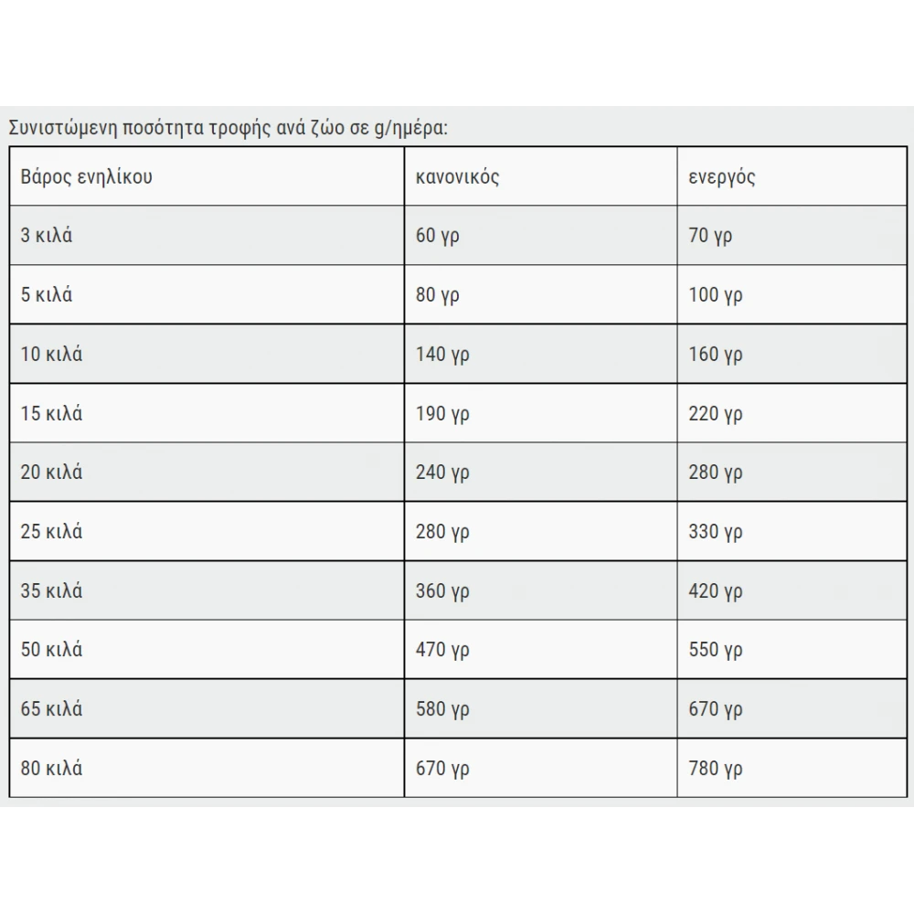 - Η περιεκτικότητα σε πρωτεΐνες και λίπος έχει προσαρμοστεί στις ενεργειακές απαιτήσεις των ενεργών σκύλων και προάγει την αντοχή και τη φυσική κατάσταση σε αθλητικές και ψυχαγωγικές δραστηριότητες.