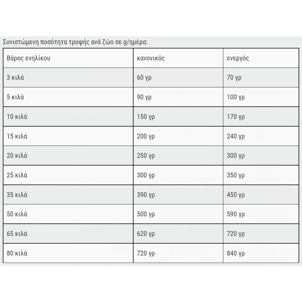 - Η ιδανική περιεκτικότητα πρωτεϊνών και λίπους είναι προσαρμοσμένη στις ανάγκες των σκύλων με φυσιολογικά επίπεδα δραστηριότητας.