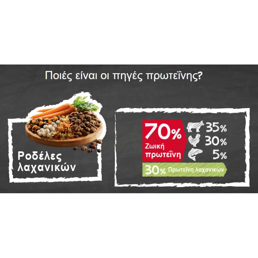 - Αναλογία ζωικής πρωτεΐνης προς ολική πρωτεΐνη: 70 % (από πουλερικά 30 %, από βόειο κρέας 35 %, από ψάρι 5 %).
