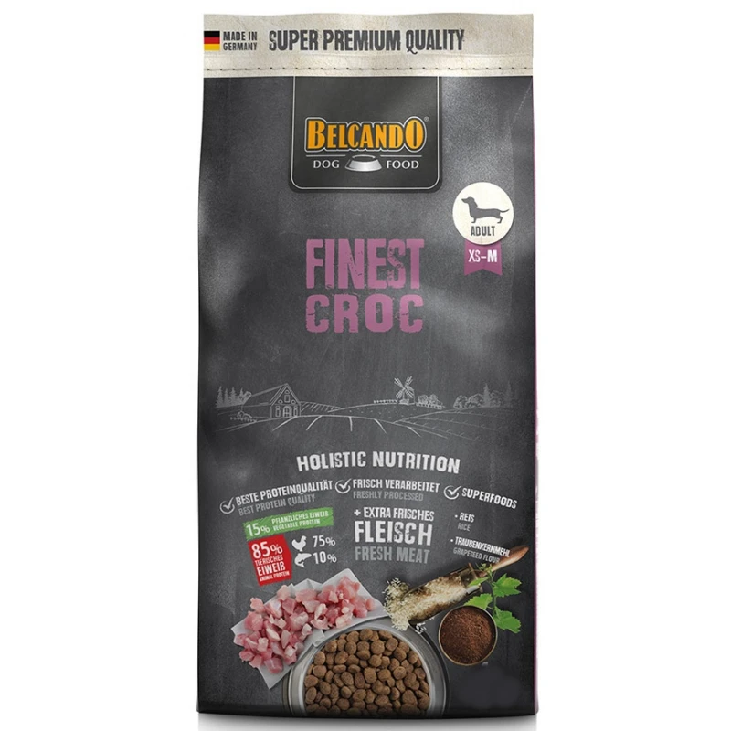 Ειδικά επιλεγμένες πρώτες ύλες, νόστιμη πάπια και συκώτι κάνουν το BELCANDO® Finest Croc την πρώτη επιλογή για τους καλοφαγάδες μεταξύ των ενήλικων σκύλων. Πολύ εύκολα εύπεπτο ρύζι και πολύτιμο αλεύρι από κουκούτσι σταφυλιού ψυχρής έκθλιψης διασφαλίζουν ότι το νόστιμο γεύμα είναι μια εξαιρετικά υγιεινή από κάθε άποψη απόλαυση. Η υψηλή αναλογία πρωτεΐνης και λίπους προάγει την πέψη και μειώνει τον όγκο των κοπράνων.