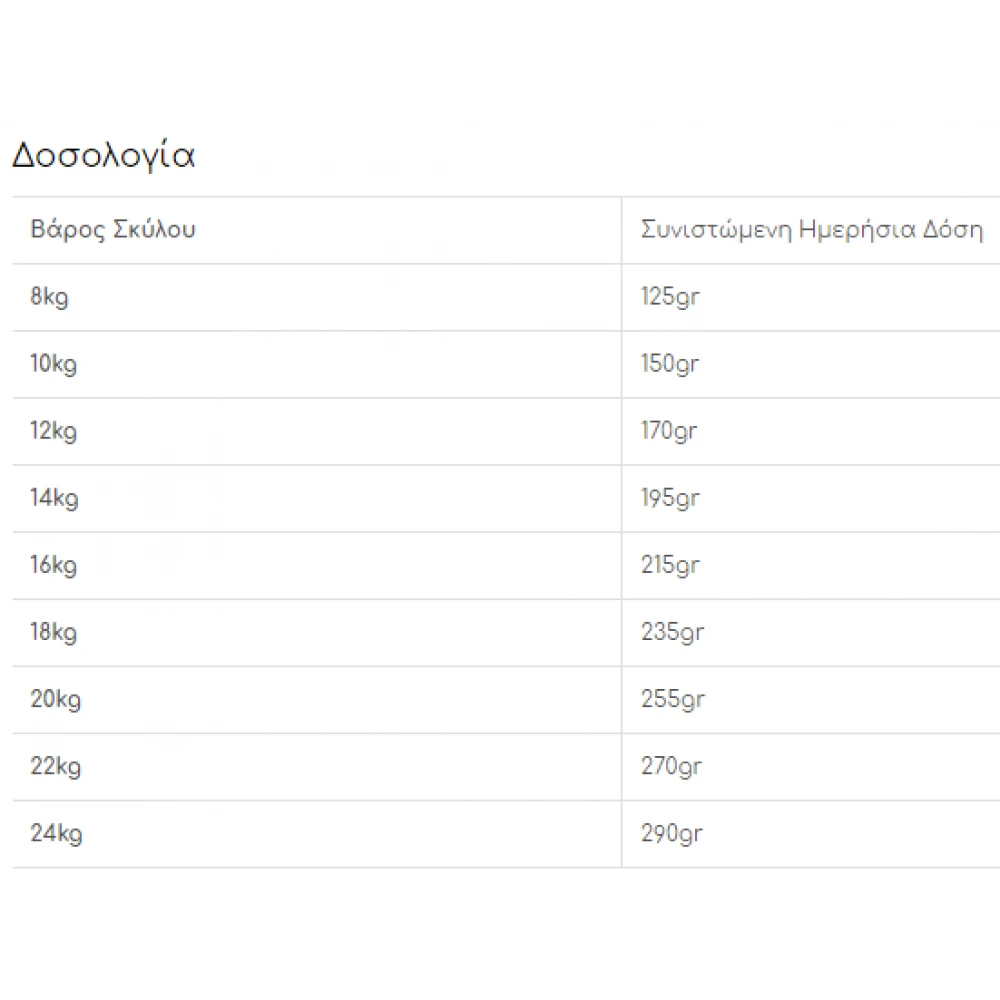 Σύνθεση : Πουλερικά 28% (Αφυδατωμένο κοτόπουλο και γαλοπούλα 20%, υδρολυμένο φρέσκο κοτόπουλο 8%), αφυδατωμένος σολομός 8%, καστανό ρύζι, ταπιόκα, ζωικό λίπος (6%), λάδι σολομού (1%), αποξηραμένος πολτός τεύτλων, αποξηραμένο χαρούπι, F.O.S. (φρουκτο-ολιγοσακχαρίτες), αφυδατωμένο μήλο, αφυδατωμένο καρότο, μαγιά μπύρας, εκχύλισμα δεντρολίβανου, γλυκοζαμίνη (0,057%), θειική χονδροϊτίνη (0,04%).