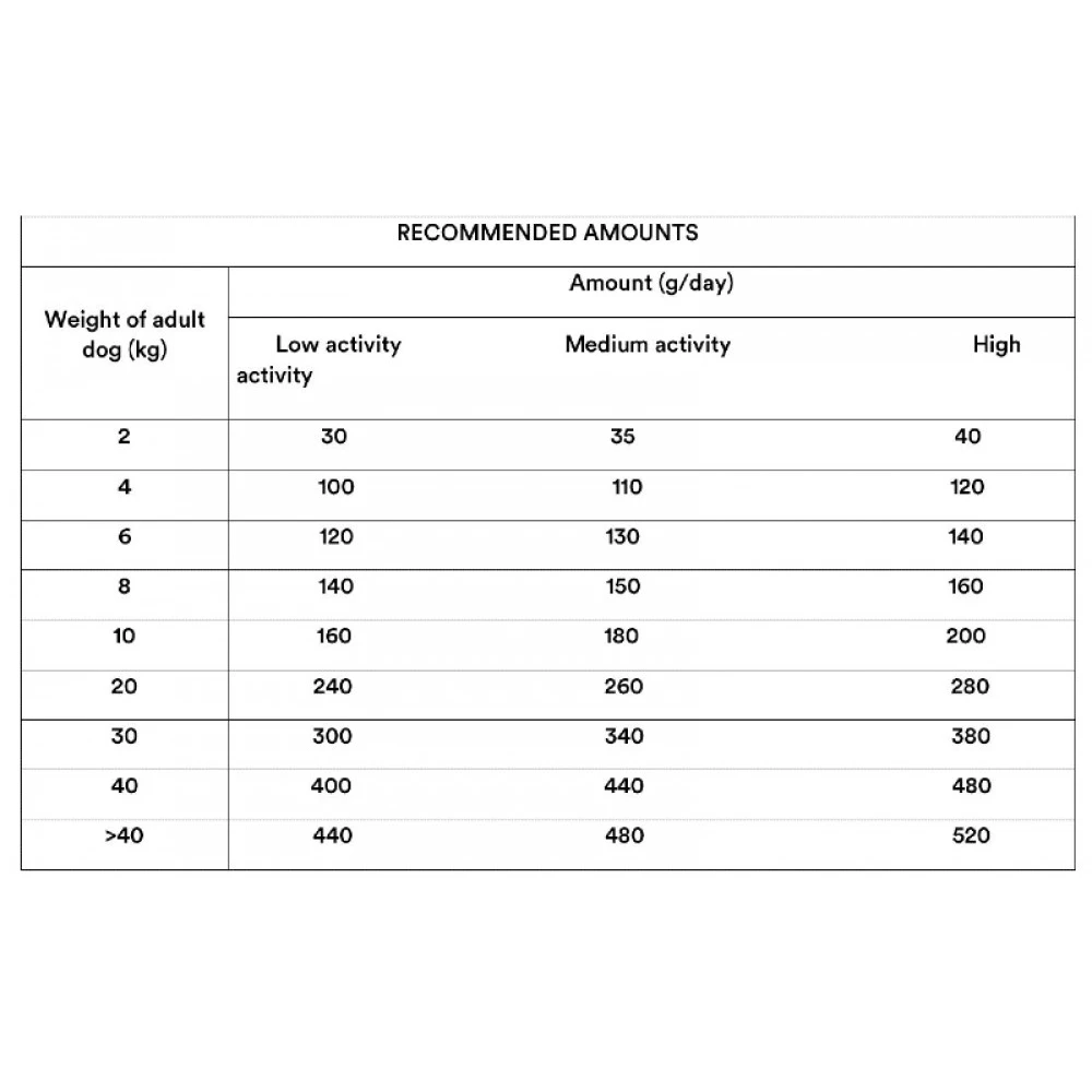 Τρόπος Χρήσης: Βάλτε την ποσότητα τροφής (βλέπε πίνακα δοσολογίας) στο πιατάκι του. Είναι σημαντικό ο σκύλος σας να έχει πάντα άφθονο, καθαρό και δροσερό νερό στη διάθεσή του. Λάβετε υπόψη σας ότι οι συνιστώμενες ποσότητες του πίνακα ποικίλλουν ανάλογα με το βάρος, τη φυσική δραστηριότητα, κ.λπ., και θα υπάρχουν και κάποιες διαφοροποιήσεις ανάλογα με την προσωπικότητα του κάθε ζώου. Οποιαδήποτε αλλαγή διατροφής πρέπει να γίνεται βαθμιαία κατά τη διάρκεια 4 ή 5 ημερών προς αποτροπή της εμφάνισης πεπτικών διαταραχών.