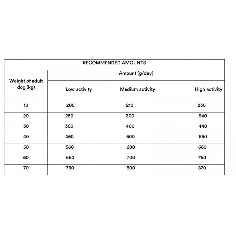 Βάλτε την ποσότητα τροφής (βλέπε πίνακα δοσολογίας) στο πιατάκι του. Είναι σημαντικό ο σκύλος σας να έχει πάντα άφθονο, καθαρό και δροσερό νερό στη διάθεσή του. Λάβετε υπόψη σας ότι οι συνιστώμενες ποσότητες του πίνακα ποικίλλουν ανάλογα με το βάρος, τη φυσική δραστηριότητα, κ.λπ., και θα υπάρχουν και κάποιες διαφοροποιήσεις ανάλογα με την προσωπικότητα του κάθε ζώου. Οποιαδήποτε αλλαγή διατροφής πρέπει να γίνεται βαθμιαία κατά τη διάρκεια 4 ή 5 ημερών προς αποτροπή της εμφάνισης πεπτικών διαταραχών.Σημείωση:Διατηρήστε τη συσκευασία καλά κλεισμένη σε ξηρό και δροσερό μέρος, μακριά από το έδαφος και την ηλιακή ακτινοβολία.