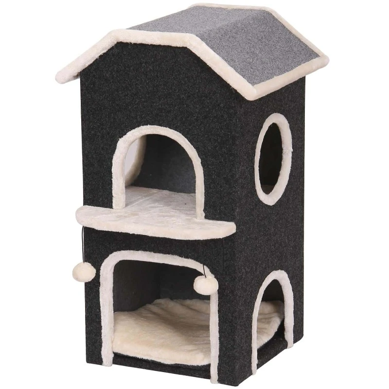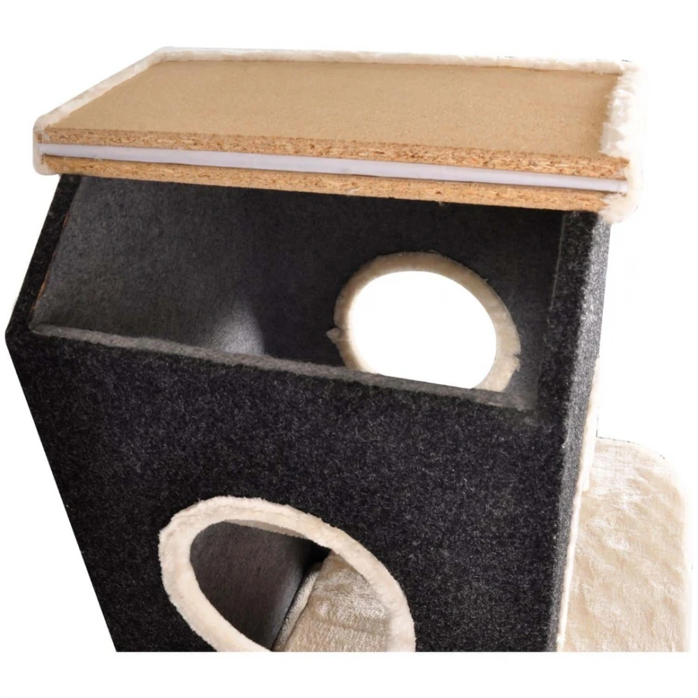Η γάτα σας μπορεί να ξαπλώνει στο κρεβατάκι επάνω στον πύργο και να χαλαρώνει, να κοιμάται ή να ονειρεύεται. Επιπλέον, αυτό το κρεβάτι έχει δυο Φωλιές: μια χαμηλά, και μια υπερυψωμένη ,ιδανικές για να χουχουλιάζει! Η γάτα σας μπορεί επίσης να βρει λίγη ησυχία και να χαλαρώσει στο εσωτερικό του δυόροφου πύργου.