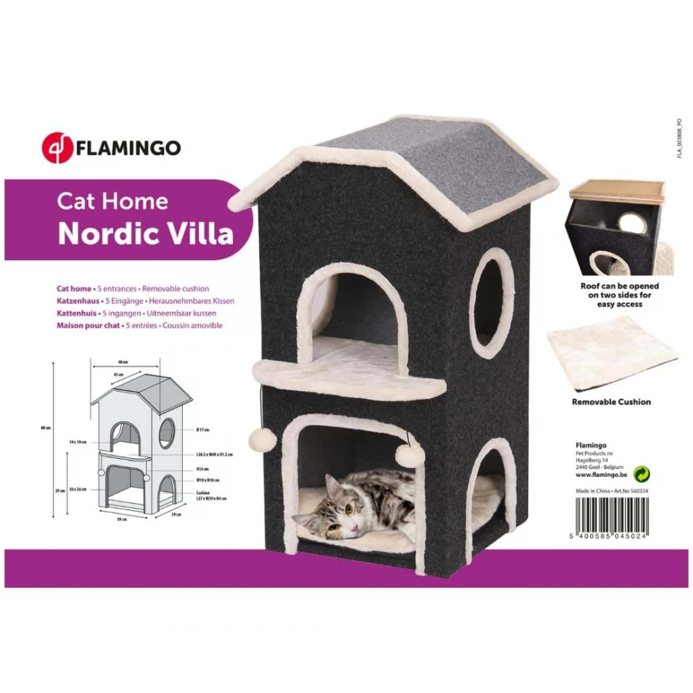 Σπιτάκι για γατούλες Flamingo Nordic Villa με πέντε εισόδους, διαθέτει άνετο και βελούδινο μαξιλάρι τo οποίο αφαιρείται εύκολα!Αυτός ο υψηλής ποιότητας, πτυσσόμενος πύργος Flamingo Flamingo Scratch Tree Nordic Villa συνδυάζει λειτουργικότητα, ποιότητα και αισθητική σε ένα προϊόν.