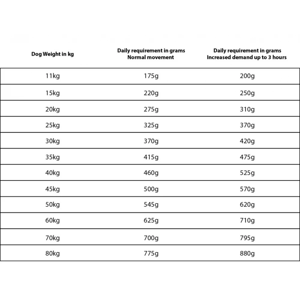 Σύνθεση: Κυνήγι, βουβάλι, μοσχάρι και πουλερικά 70%(νωπό κρέας κυνηγιού 18%, φρέσκο βόειο κρέας 17%, φρέσκο κρέας πουλερικών 15%, κρέας βουβάλι αποξηραμένο και ψιλοκομμένο 7%, κρέας πουλερικών αποξηραμένο και ψιλοκομμένο 5%, λίπος πουλερικών 5%, μοσχαρίσιο κρέας 3%), λαχανικά 20%(νιφάδες πατάτας, σπανάκι, καρότα), σπόροι ροδιού 4%(αποξηραμένα και ψιλοκομμένα), λάδι σολομού 2%, μέταλλα 1,5%, βιταμίνες 0,5%, βότανα από λιβάδια βουνού Allgäu 0,5% , πλάτανο, ribwort, χαμομήλι, πικραλίδα, κατιφέ), κιχώριο 0,5% (ψιλοκομμένο, με φυσικό FOS και ινουλίνη), βότανα0,3% (μέντα, θυμάρι, ρίγανη, φασκόμηλο, μαϊντανός, μαντζουράνα, σπόροι γλυκάνισου), φρούτα 0,3% (κράνμπερι, βατόμουρα, μήλα), φύκια 0,2% (knotweed, σπιρουλίνα), μύδια Νέας Ζηλανδίας με πράσινα χείλη 0,1% (ψιλοκομμένα , φυσικά πλούσιο σε γλυκοζαμίνη και χονδροϊτίνη), yucca schidigera 0,1%
