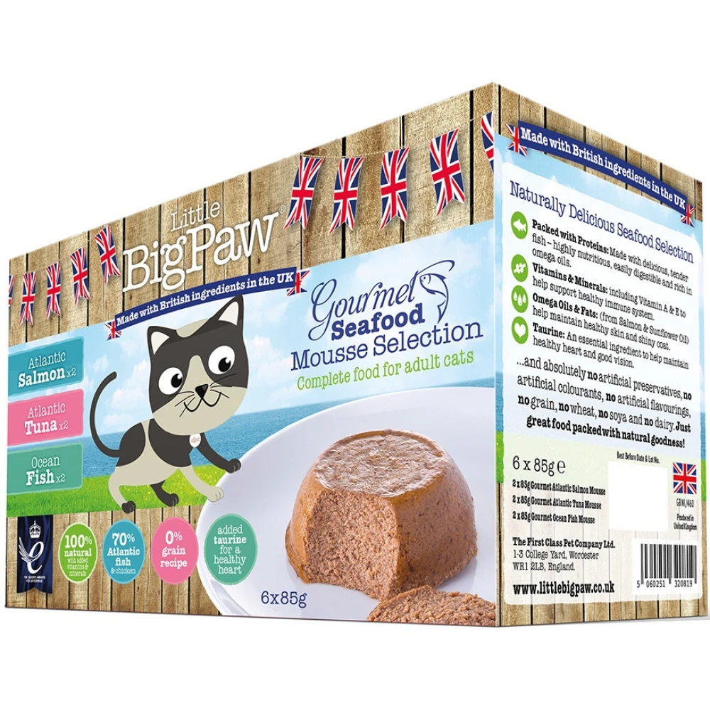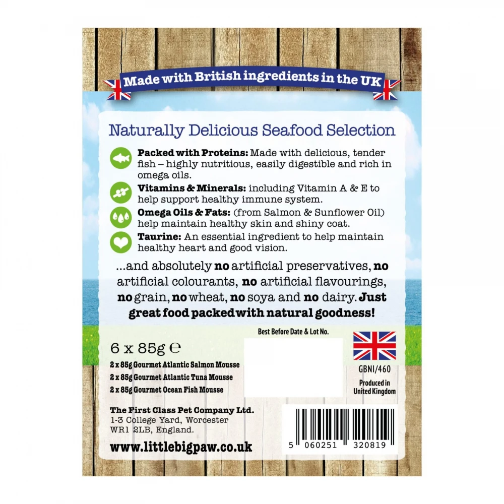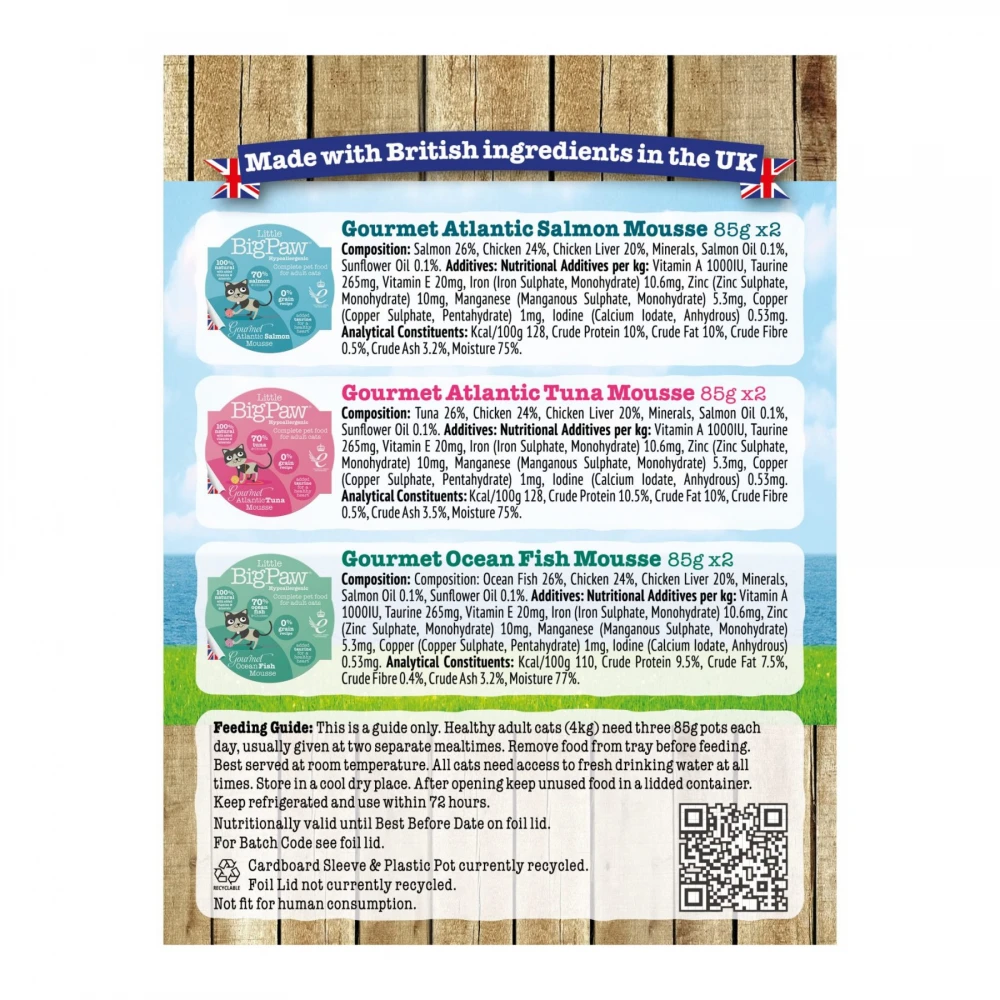 Η υπέροχη γεύση του Little BigPaw σε μια εύχρηστη συσκευασία πακέτου τριών διαφορετικών γεύσεων : περιέχει 2 x σολομό Ατλαντικού, 2 x τόνο, 2 x ψάρια ωκεανού.