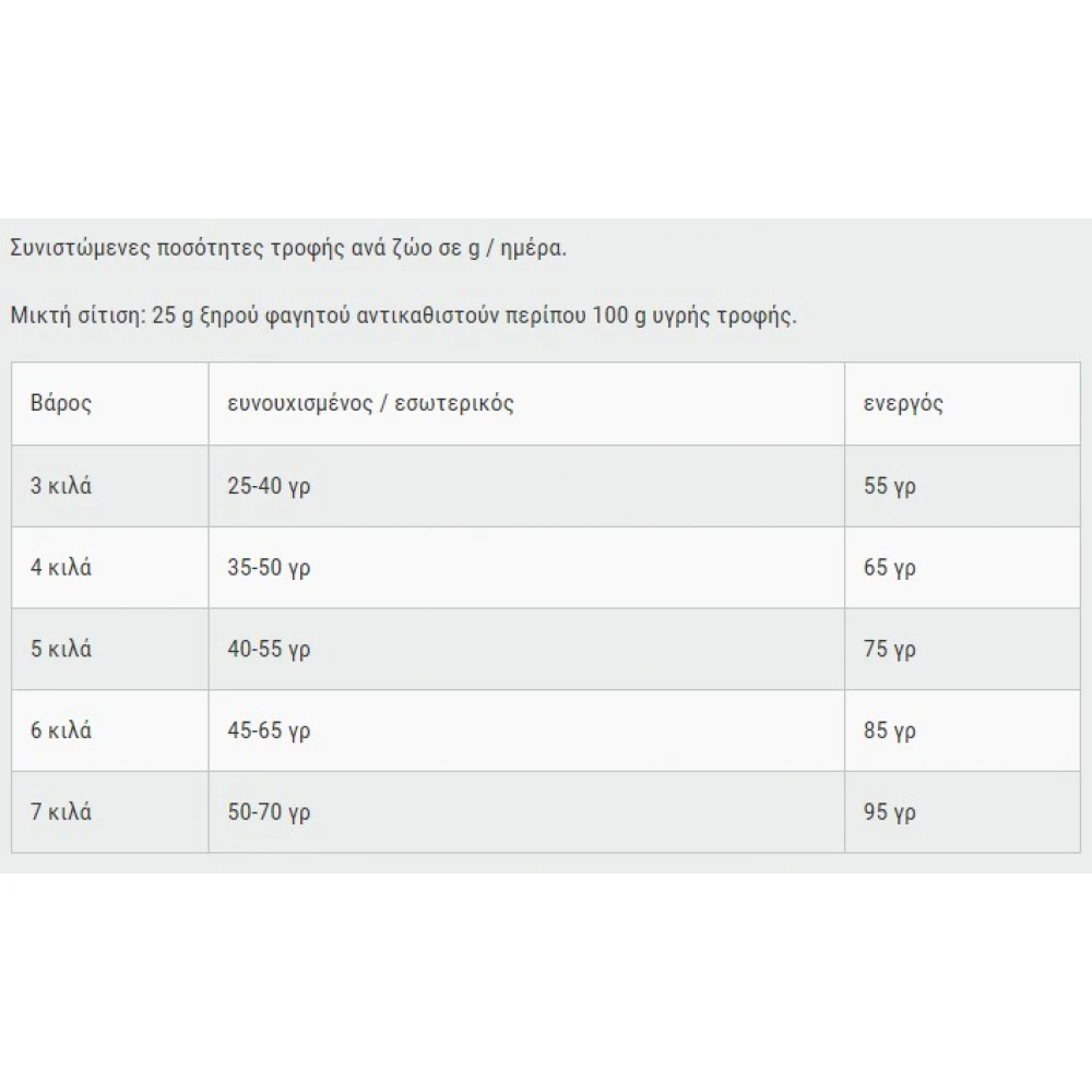 Νωπό κρέας πουλερικών (30%) Πρωτεΐνη πουλερικών, χαμηλή τέφρα, αποξηραμένα (22%) Amaranth (15%); Αμυλο πατάτας; Αλεύρι μπιζελιού; Λίπος πουλερικών; Συκώτι πουλερικών, υδρολυμένο; Θαλάσσιο ζωοπλαγκτόν, έδαφος (κριλ, 2,5%); Θαλασσινό γεύμα (2,5%) Μαγιά μπύρας, αποξηραμένη (2,5%) Αυγό, αποξηραμένο; Εξωθητής σπόρων σταφυλιών; Σπόροι Chia (1,3%); Γεύμα χαρούπι, αποξηραμένο Χλωριούχο νάτριο; Χλωριούχο κάλιο; Φωσφορικό ασβέστιο; Ινουλίνη ραδικιού