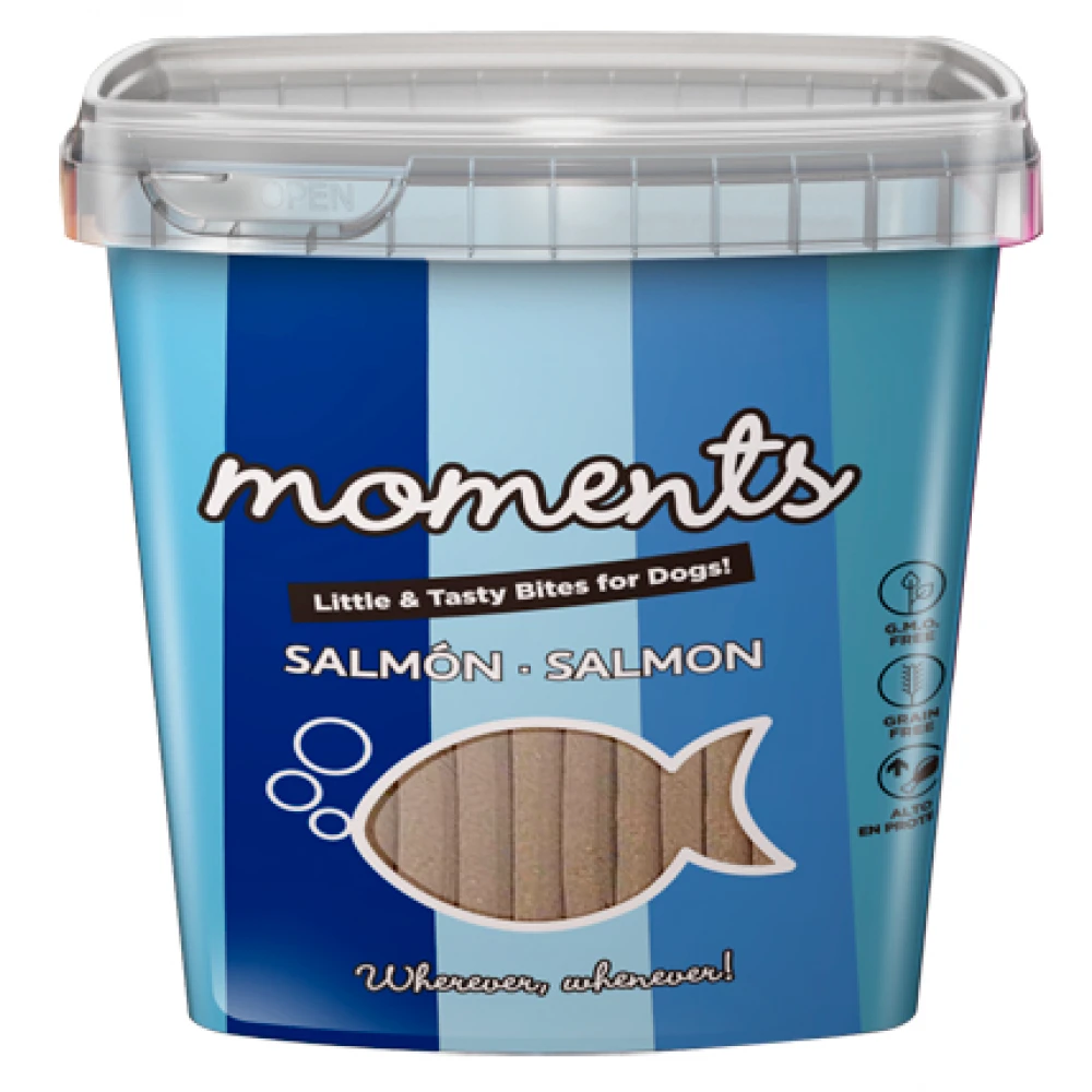 Λιχουδιές για σκύλους με φρέσκο σολομό. H σειρά Moments by BOCADOS διαφέρει!!! Τα snack μας παρασκευάζονται από τουλάχιστον 70% φρέσκο κρέας και λαχανικά.