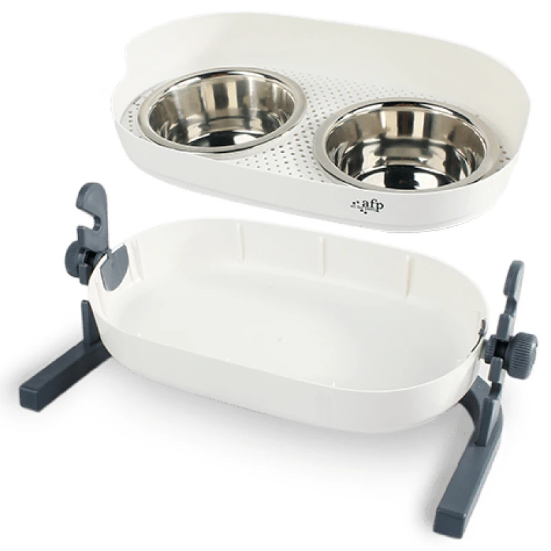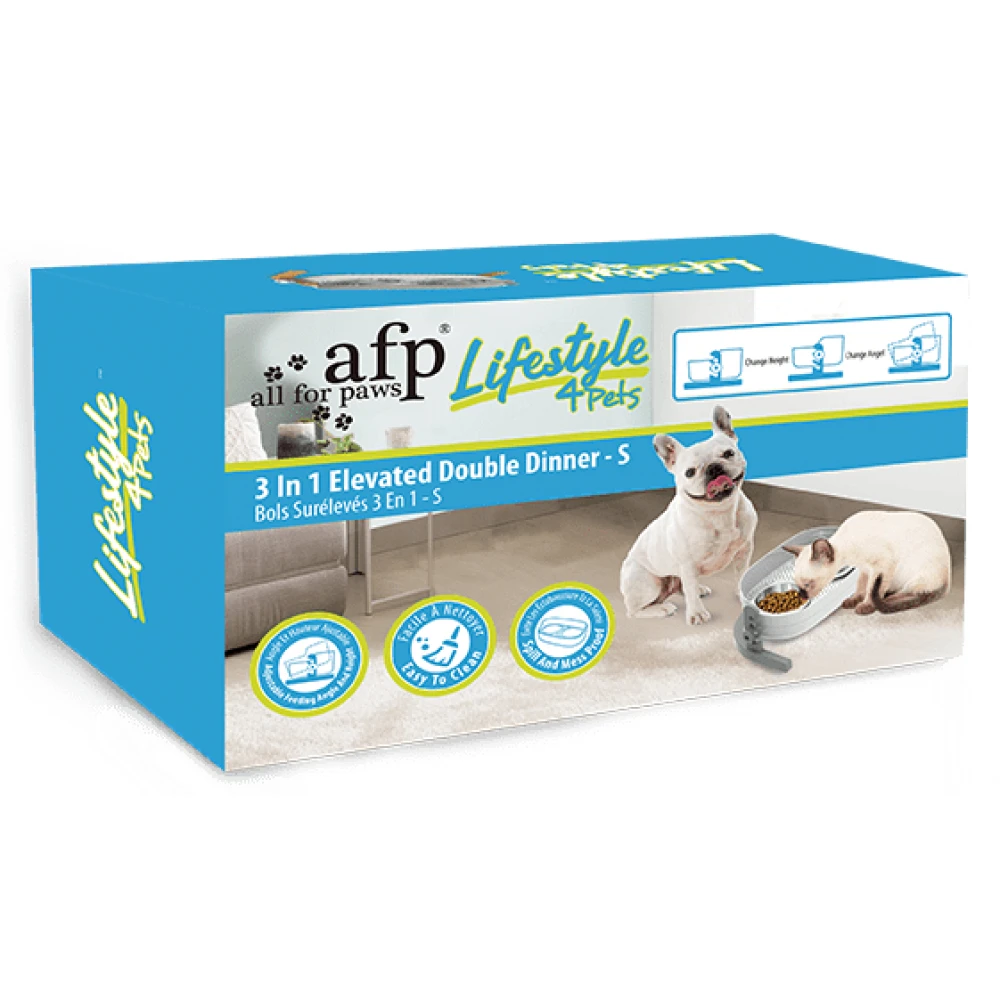 Μπολ Σκύλου 3 σε 1 Double Dinner Afp S 2x200ml. Ανθεκτική διπλή ταΐστρα. Η τροφή παραμένει στην κορυφή και το νερό στο κάτω μέρος. Δίνει στο κατοικίδιό σας ψηλή θέση σίτισης το οποίο βοηθάει στην πέψη και τις αρθρώσεις. Μπορείτε να προσαρμόσετε επίσης τη γωνία του μπολ ώστε να ταιριάζει καλύτερα στις ειδικές ανάγκες των κατοικίδιων. Είναι εύκολο να συναρμολογηθεί και να καθαριστεί. Διπλώματα ευρεσιτεχνίας που εκκρεμούν.