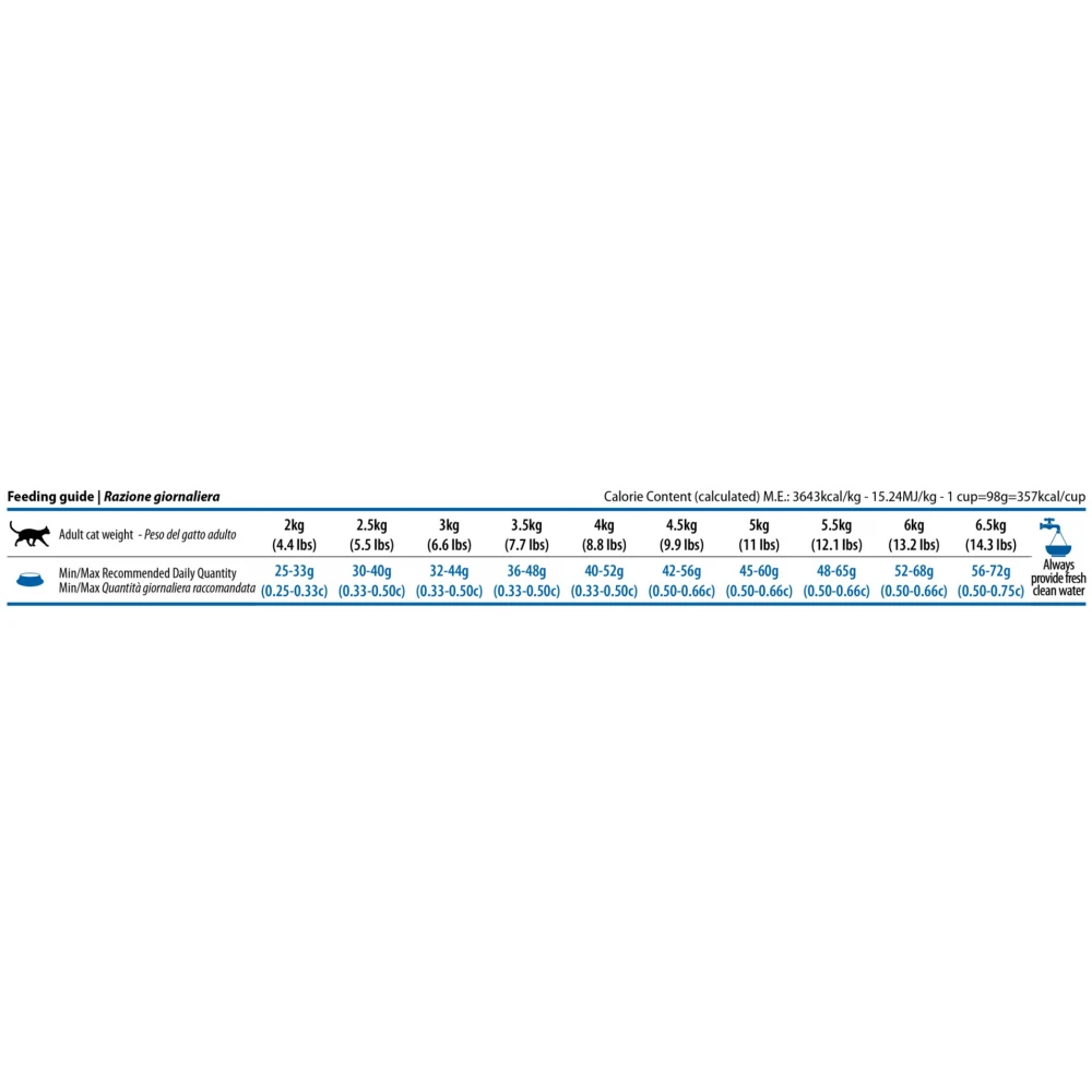 Ακατέργαστη πρωτεΐνη (ελάχ.): 46,00%; Ακατέργαστο λίπος (ελάχ.): 11,00%; Ακατέργαστες ίνες (μέγιστο): 5,10% Υγρασία (μέγιστο) 8,00%; Τέφρα (μέγιστο): 8,70%; Docosahexaenoic Acid (DHA) (min): 0,30%; Εικοσαπεντανοϊκό οξύ (EPA) (min): 0,10%; Ασβέστιο (min): 1,50%; Φώσφορος (min): 1,30%; Ταυρίνη (min): 0,40%; Ωμέγα ‐ 6 λιπαρά οξέα * (ελάχ.): 2,00%; Ωμέγα ‐ 3 λιπαρά οξέα * (λεπτά): 0,45%.