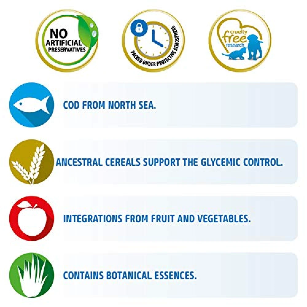 ΣΥΝΘΕΣΗ: Φρέσκος μπακαλιάρος (24%), αφυδατωμένος μπακαλιάρος (24%), ιχθυέλαιο, όλυρα (10%), βρώμη (10%), αφυδατωμένος πολτός τεύτλων, φυτικές ίνες μπιζελιού, αφυδατωμένα καρότα, αφυδατωμένο alfalfa, ινουλίνη, φρουκτοολιγοσακχαρίτες, μαννανολιγοσακχαρίτες, αφυδατωμένο πορτοκάλι (0.5%), αφυδατωμένο μήλο, αφυδατωμένο ρόδι, κονιορτοποιημένο σπανάκι, ψύλλιο (0.3%), κονιορτοποιημένα φραγκοστάφυλα, κονιορτοποιημένα μύρτιλλα, χλωριούχο νάτριο, αποξηραμένη ζυθοζύμη, κιτρινόριζα (0.2%), γλουκοζαμίνη, θειϊκή χονδροϊτίνη, εκχύλισμα ταγίτη λουλούδι (πηγή λουτεΐνης).