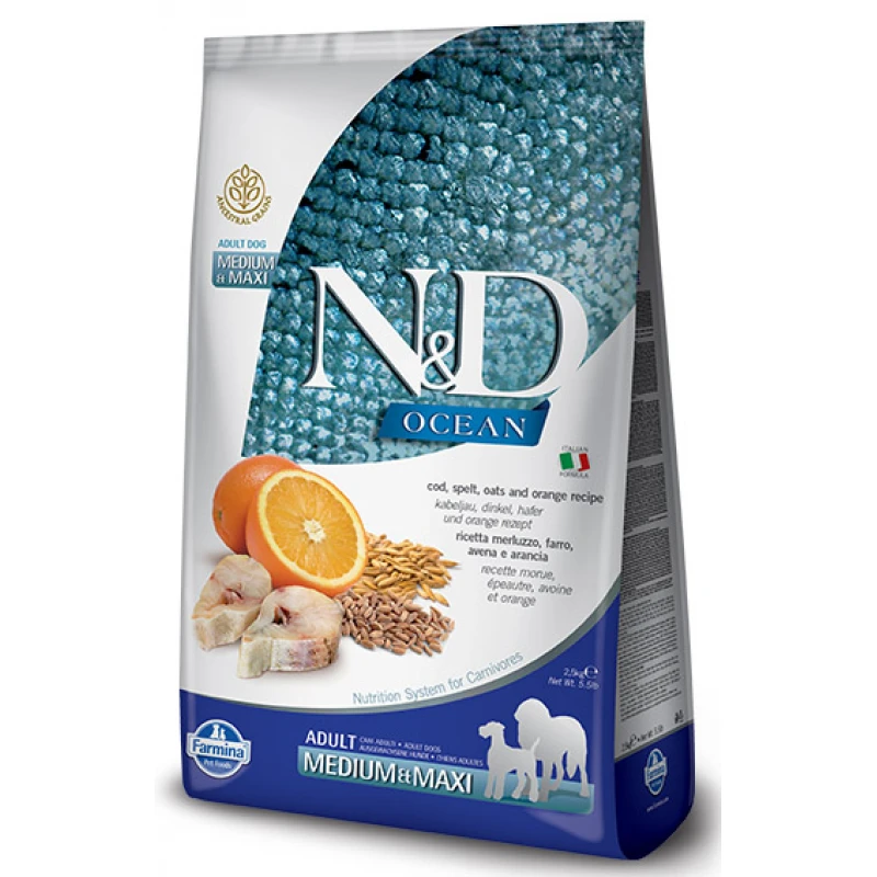 Ξηρά τροφή σκύλου Farmina N&D Ocean Low Grain Cod & Orange Adult Medium & Maxi 12kg με Μπακαλιάρο και Πορτοκάλι.Για μεσαίου και μεγάλου μεγέθους σκύλους.