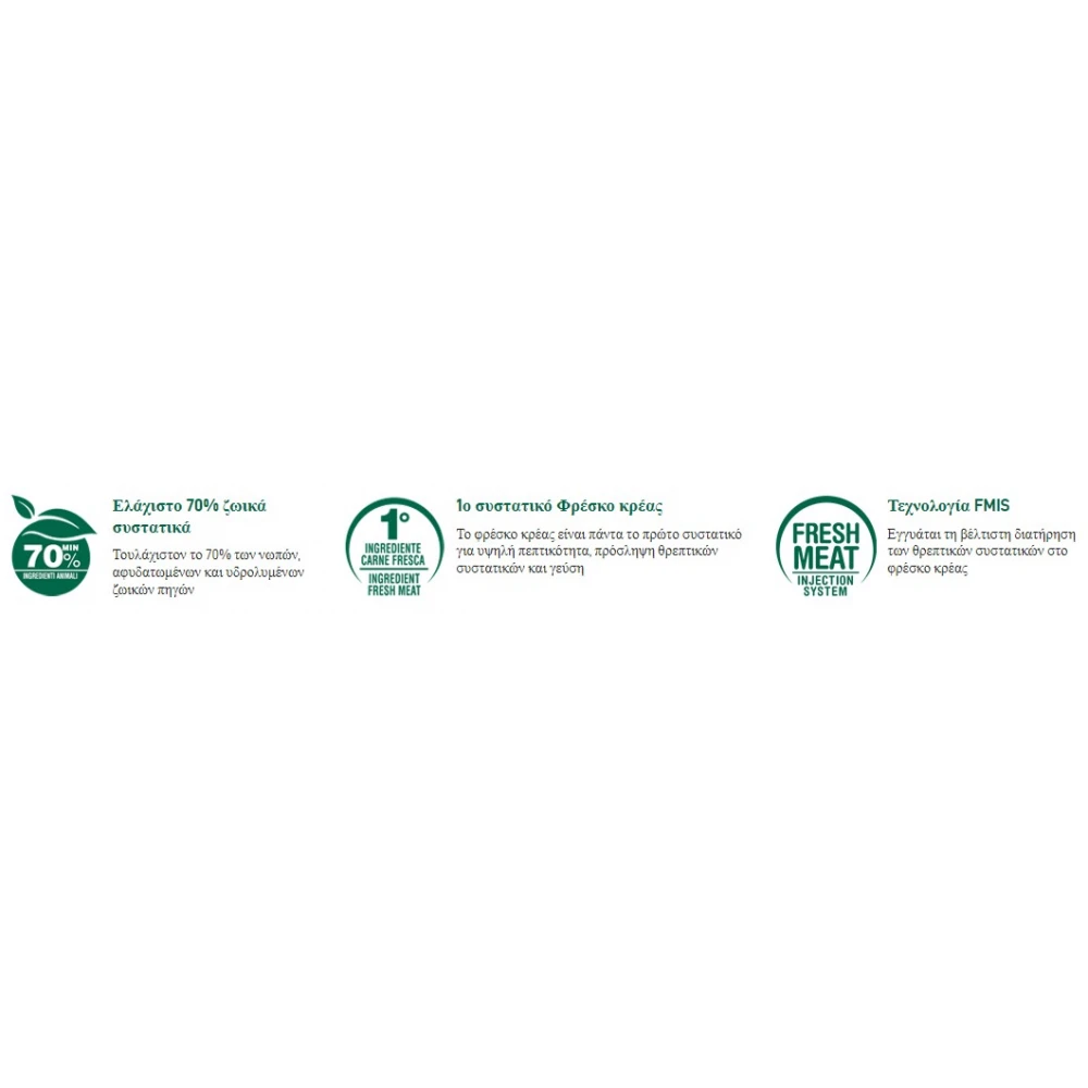 ΣΥΝΘΕΣΗ: φρέσκος σολομός 40%, αφυδατωμένος σολομός 30%, ρύζι 12%, καλαμπόκι, υδρολυμένος σολομός 5%, γλουτένη καλαμποκιού, αφυδατωμένα πουλερικά, λίπος κοτόπουλου, μαγιά μπύρας, πρωτεΐνη ρυζιού, πολτός τεύτλων 1%, ιχθυέλαιο, μέταλλα, ινουλίνη 1.000 mg/ kg (πηγή φρουκτο-ολιγοσακχαριτών), μαννανολιγοσακχαρίτες 1.000 mg/kg, εκχύλισμα εσπεριδοειδών, γιούκα Mojave.
