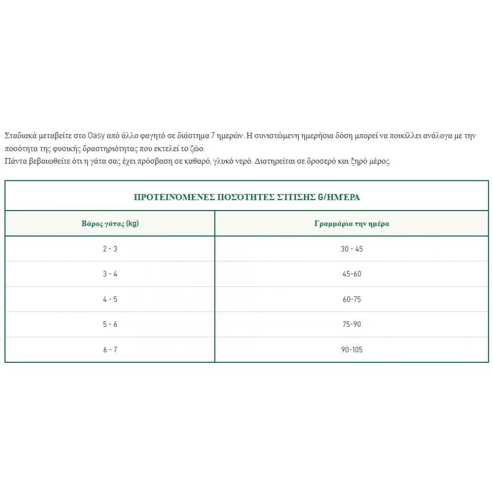 Κορεσμός: Η υψηλότερη περιεκτικότητα σε φυτικές ίνες (σε σύγκριση με το Oasy Adult Chicken) κάνει τη γάτα να αισθάνεται πιο χορτασμένη, βοηθώντας στον έλεγχο της πείνας μεταξύ του ενός γεύματος και του επόμενου.