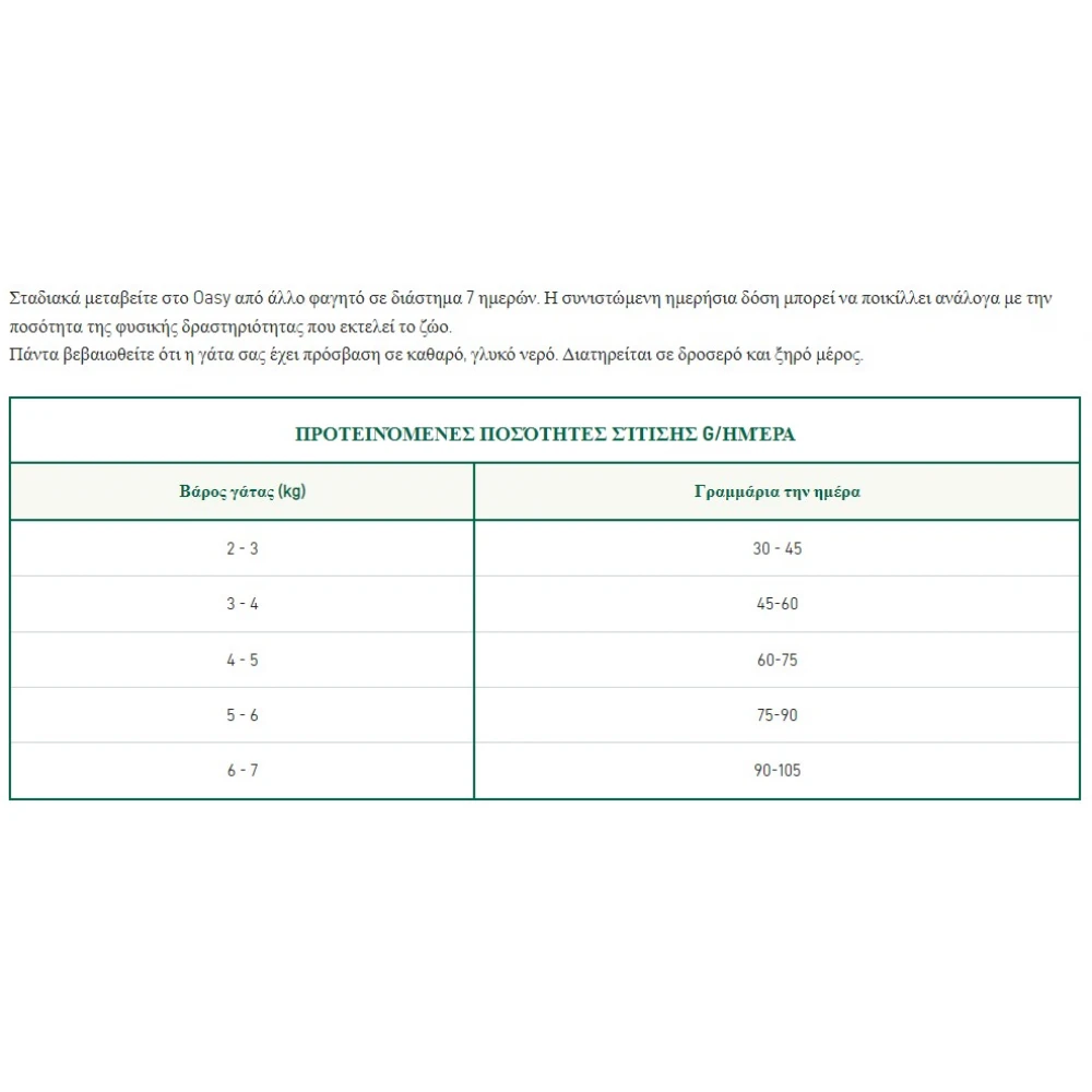 Κορεσμός: Η υψηλότερη περιεκτικότητα σε φυτικές ίνες (σε σύγκριση με το Oasy Adult Salmon) κάνει τη γάτα να αισθάνεται πιο χορτασμένη, βοηθώντας στον έλεγχο της πείνας μεταξύ του ενός γεύματος και του επόμενου.