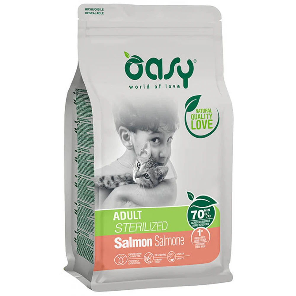 Oasy Cat Sterilised Adult Salmon 1,5kg. Πλήρης τροφή με σολομό για στειρωμένες ενήλικες γάτες.Φροντίστε τη στειρωμένη γάτα σας. Με περισσότερα από 70% ζωικά συστατικά και συγκεκριμένα οφέλη για την υποστήριξη ενός υγιούς ουροποιητικού συστήματος και ελέγχου του βάρους, θα προάγετε την ευεξία και τη ζωτικότητά της γάτας σας κάθε μέρα.