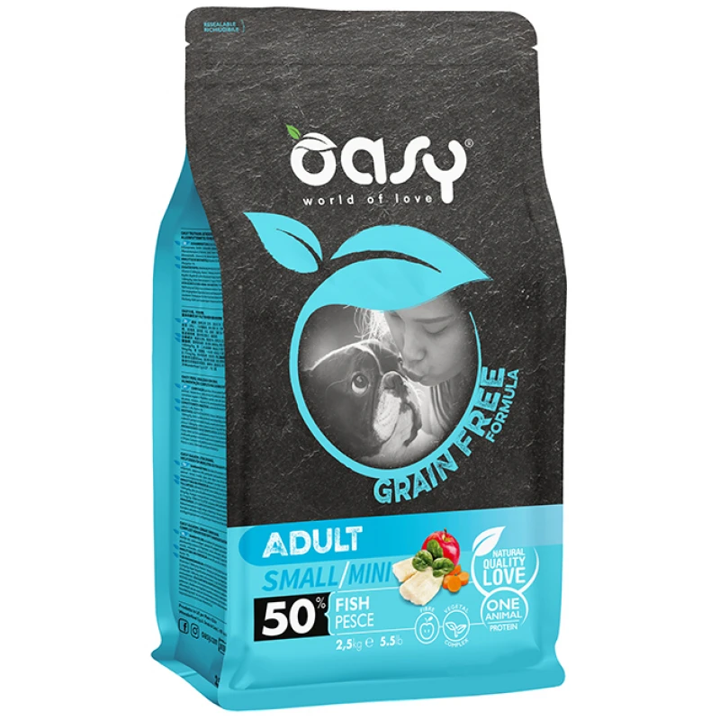 Oasy Dry Dog Grain Free Adult Small-Mini Fish 2,5kg. Σεβαστείτε τη σαρκοφάγο φύση του σκύλου σας. Με σύνθεση χωρίς δημητριακά και γλουτένη και με υψηλή ποσότητα κρέατος για μέγιστη γευστικότητα, αυτή είναι η τέλεια τροφή για τον ενήλικο σκύλο σας. Περιλαμβάνει 50% ψάρι ως μοναδική πηγή ζωικής πρωτεΐνης, είναι ιδανικό και για σκύλους με ευαισθησίες.