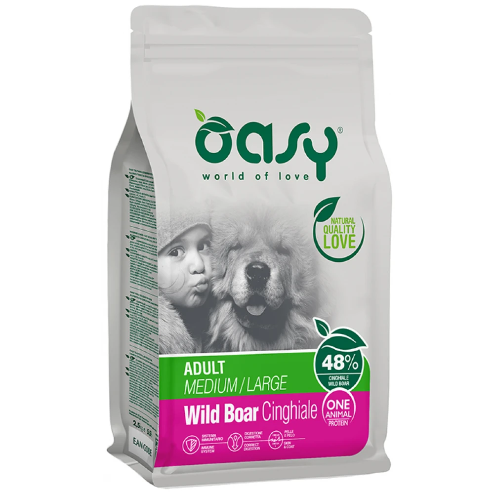 Oasy Dry Dog One Animal Protein Adult Medium – Large Wild Boar 2,5kg. Μονοπρωτεϊνική ,Περιέχοντας 48% κρέατος αγριογούρουνου ως μεμονωμένης ζωικής πρωτεΐνης, αυτή η ξηρή τροφή είναι ιδανική για ενήλικους σκύλους, ιδιαίτερα αυτούς με τροφικές δυσανεξίες, εντερικές ή δερματικές ευαισθησίες. Η σωστή πρόσληψη βιταμινών και μετάλλων βοηθά να διατηρείτε τον σκύλο μεσαίου ή μεγάλου μεγέθους δραστήριο και ζωηρό.