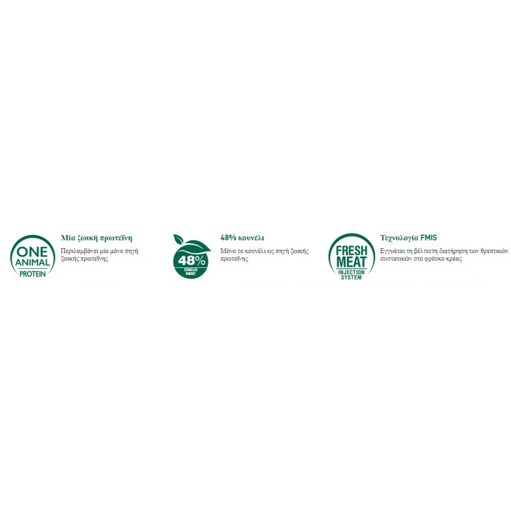 ΣΥΝΘΕΣΗ: φρέσκο κρέας κουνελιού 30%, ρύζι, αφυδατωμένο κουνέλι 15%, πρωτεΐνη ρυζιού, ζωικό λίπος, υδρολυμένο κουνέλι 3%, πολτός τεύτλων 2,5%, μαγιά μπύρας 1%, μέταλλα, ιχθυέλαιο, ινουλίνη 1.000 mg/kg (πηγή φρουκτο-ολιγοσακχαριτών) , τζίντζερ 0,1%, μαννάνη-ολιγοσακχαρίτες 1.000 mg/kg, Mojave yucca 170 mg/kg.