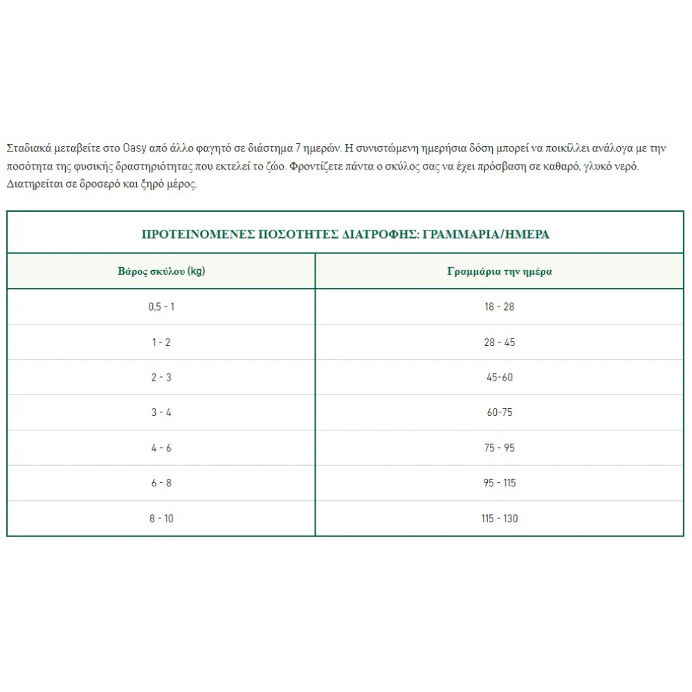 ΑΝΑΛΥΤΙΚΑ ΣΥΣΤΑΤΙΚΑ: ακατέργαστη πρωτεΐνη 28%, ακατέργαστο λίπος 17%, ωμέγα-6 λιπαρά οξέα 2,35%, ωμέγα-3 λιπαρά οξέα 0,45%, EPA + DHA 500 mg/kg, ακατέργαστες ίνες 2,85%, ακατέργαστη τέφρα 7%, ασβέστιο 1,2%, φώσφορος 1 %, υγρασία 9%.
