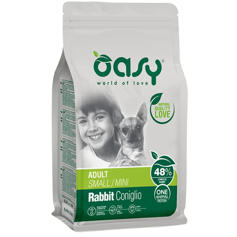 Oasy Dry Dog One Animal Protein Adult Small-Mini Rabbit 2,5kg. Μονοπρωτεϊνική ,Περιέχοντας 48% κρέας Κουνελιού ως πρωτεΐνη μεμονωμένης ζωικής προέλευσης, αυτή η ξηρή τροφή είναι ιδανική για ενήλικους σκύλους, ιδιαίτερα αυτούς με τροφικές δυσανεξίες, εντερικές ή δερματικές ευαισθησίες. Οι μικρές κροκέτες παρέχουν Ασβέστιο και Φώσφορο, για την ευημερία του μικρόσωμου σκύλου σας.