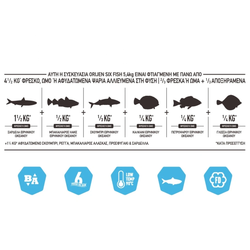 Η ORIJEN® Six Fish ετοιμάζεται με ψάρια που αλιεύονται στη φύση, όπως σαρδέλα, μπακαλιάρος, σκουμπρί, καλκάνι, σεβαστός και γλώσσα. Πλούσια σε WholePrey αναλογίες ζωικών συστατικών και γεμάτη θρεπτικά στοιχεία, αυτή η συνταγή προσφέρει στη γάτα σας μια δίαιτα απαράμιλλης ποιότητας.