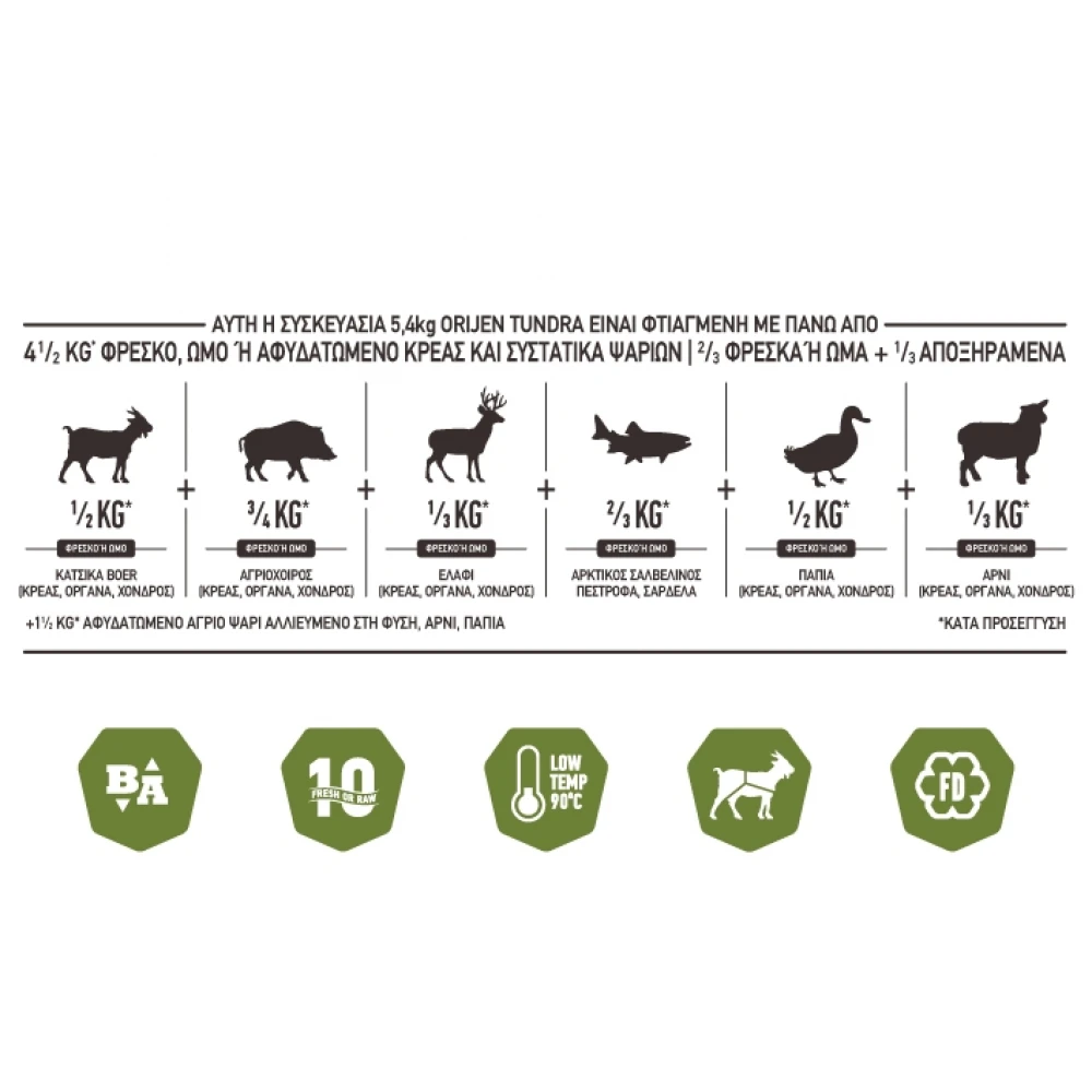 Πλούσια σε WholePrey αναλογίες ζωικών συστατικών και γεμάτη θρεπτικά στοιχεία, η ORIJEN® Tundra είναι μια συνταγή που δεν συγκρίνεται με καμία άλλη.