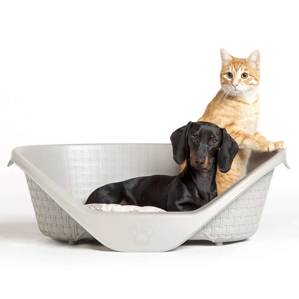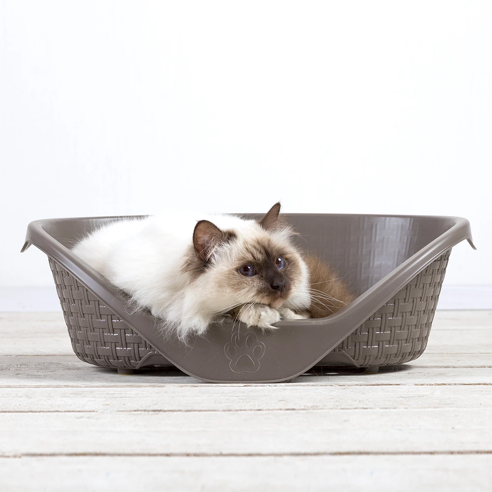 Κομψό πλαστικό κρεβάτι με εργονομικό σχεδιασμό & πλεκτή υφή (rattan) για ευχάριστη χαλάρωση σε γάτες και σκύλους. Διαθέτει ειδική βάση που επιτρέπει τον αερισμό και αντιολισθητικά πόδια για σταθερότητα. Εύκολο στο καθάρισμα. Διατίθεται σε 3 μεγέθη και σε μίξη χρωμάτων (Γκρι ή Καφέ).