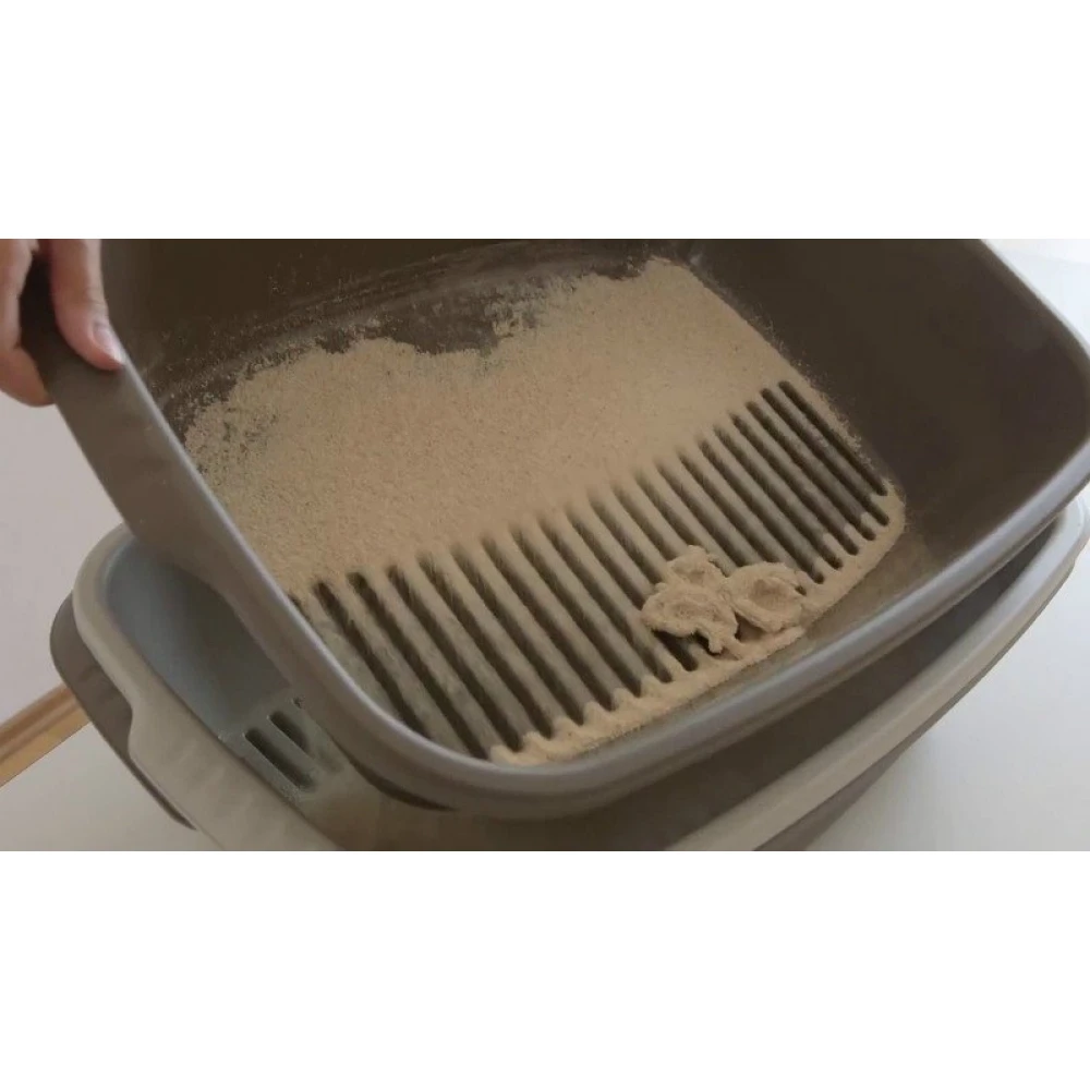 Πρόκειται για ένα δοχείο απορριμάτων γάτας με τρεις εναλλασσόμενους δίσκους όπως το κόσκινο που κάνουν εύκολο τον καθαρισμό.