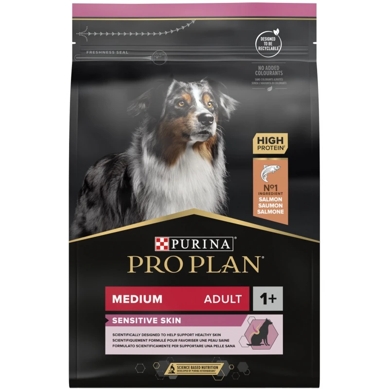 Η Pro Plan Medium Adult Sensitive Skin είναι κλινικά αποδεδειγμένο ότι ενισχύει την υγεία του δέρματος διότι περιέχει επιλεγμένες πηγές πρωτεϊνών για ευαίσθητους σκύλους οι οποίες βοηθούν στη μείωση πιθανών δερματικών παθήσεων που σχετίζονται με ευαισθησία στην τροφή.