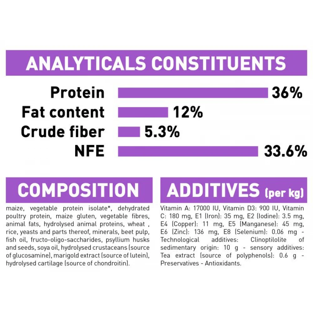 Σύνθεση: καλαμπόκι, πρωτεΐνη πουλερικών (αποξηραμένη), απομονωμένη φυτική πρωτεΐνη*, γλουτένη αραβοσίτου, λιγνοκυτταρίνη, ζωικό λίπος, ζωική πρωτεϊνη (υδρολυμένη), μεταλλικά στοιχεία, πούλπα σακχαροτεύτλων, ζύμες, ιχθυέλαιο, φρουκτο-ολιγοσακχαρίτες, σογιέλαιο, σπόροι σταφυλιού και πράσινο τσάι [πηγή πολυφαινολών], υδρολυμένα οστρακοειδή [πηγή γλυκοζαμίνης], άλευρο καλέντουλας [πηγή λουτεΐνης], υδρόλυμα χόνδρων [πηγή χονδροϊτίνης].