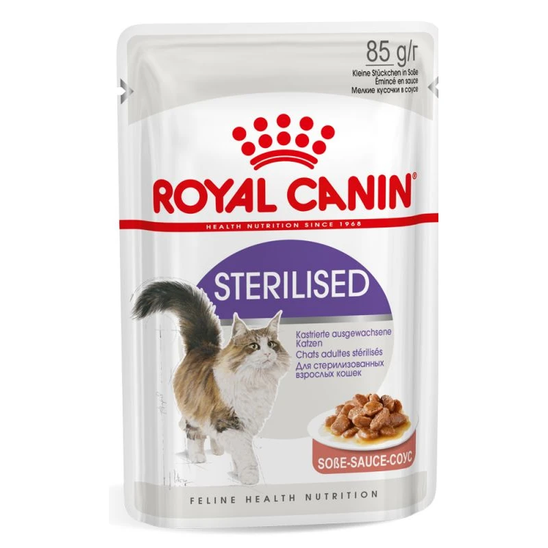 Υγρή τροφή Royal Canin Sterilised για ενήλικες, στειρωμένες γάτες άνω του 1 έτους, λεπτά κομματάκια, ενισχύει την υγεία του ουροποιητικού, συμβάλλει στη διατήρηση ιδανικού βάρους, ιδιαίτερα γευστική.