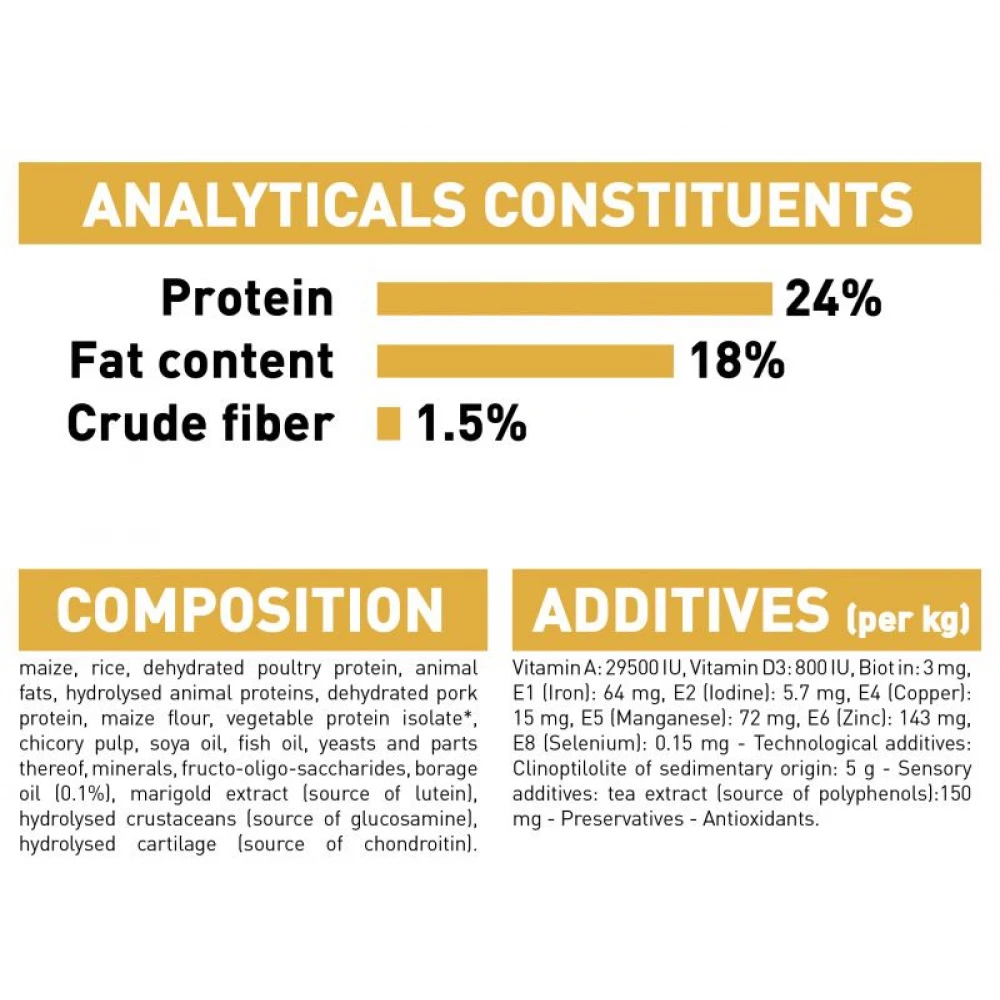 καλαμπόκι, ρύζι, πρωτεΐνες πουλερικών (αποξηραμένες), ζωικό λίπος, ζωικές πρωτεΐνες (υδρολυμένες), πρωτεΐνες χοιρινού (αποξηραμένες), άλευρο αραβοσίτου, προϊόν απομόνωσης φυτικής πρωτεΐνης*, ινουλίνη κιχωρίου, σογιέλαιο, ιχθυέλαιο, ζυμομύκητες και τα μέρη τους, μέταλλα, φρουκτοολιγοσακχαρίτες, έλαιο βοράγου (0,1%),καλέντουλα σε σκόνη [πηγή λουτεΐνης], υδρόλυμα από οστρακοειδή [πηγή γλυκοζαμίνης], υδρόλυμα από χόνδρους [πηγή χονδροϊτίνης].