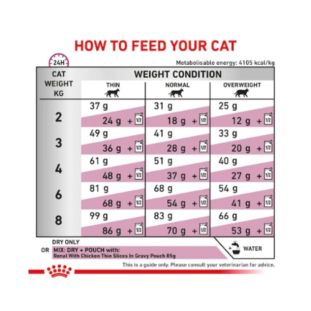 - Υποστήριξη νεφρικής λειτουργίας για γάτες με χαμηλή περιεκτικότητα σε φωσφόρο και μέτρια πρωτεΐνη, προσαρμοσμένη ενέργεια και διέγερση της όρεξης με ειδικό αρωματικό προφίλ και σχήμα κροκέτας.
