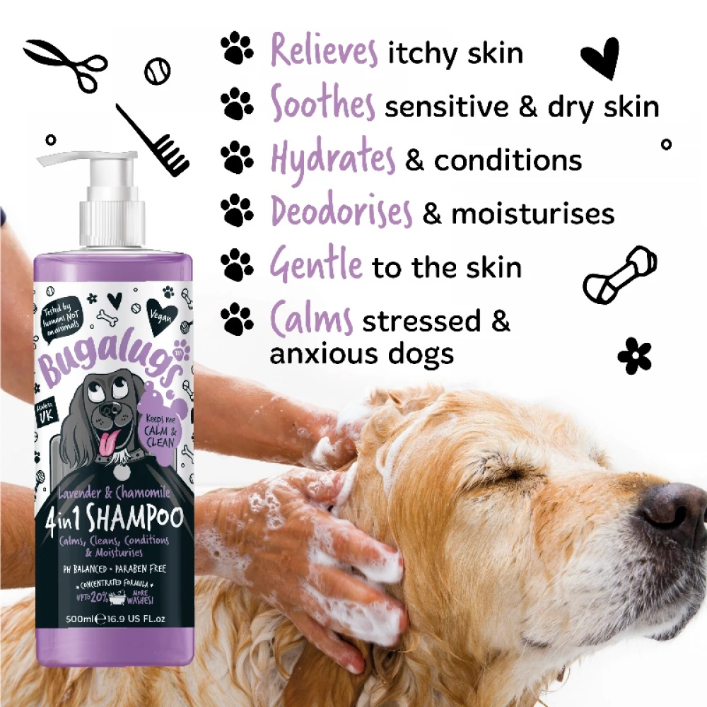 Το σαμπουάν 4 σε 1 Lavender & Chamomile 250ml για σκύλους είναι vegan και παρασκευάζεται στο Ηνωμένο Βασίλειο με νερό από την περιοχή Lake District. Λειτουργεί καλά ως σαμπουάν για κουτάβι για το ευαίσθητο δέρμα, αφαιρώντας ρύπους και λίπος, αφήνοντας το τρίχωμα απαλό και λαμπερό. Μπορεί να αραιωθεί σε αναλογία 10:1.