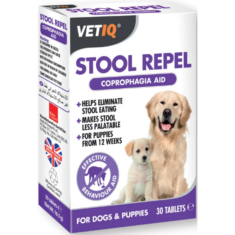 Η κοπροφαγία είναι μια συμπεριφορά όπου κουτάβια και σκύλοι καταναλώνουν τα κόπρανά τους. Είναι ένα σύνηθες φαινόμενο σε μερικά σκυλιά που αγχώνει τον ιδιοκτήτη και είναι ανθυγιεινό για το ζώο. Τα δισκία VetIQ Stool Repel έχουν σχεδιαστεί ειδικά για να αποτρέψουν αυτή τη συμπεριφορά κάνοντας τα κόπρανα του ζώου λιγότερο εύγευστα προς κατανάλωση. Το VetIQ Stool Repel περιέχει Oleoresin Capsicum, έναν δακρυγόνο παράγοντα που αποτρέπει το κουτάβι ή σκύλο από το να καταναλώσει τα κόπρανά του, δημιουργώντας μια ελαφριά ενόχληση στα μάτια και μια ήπια αίσθηση καψίματος εάν γίνει κατανάλωση. Ακόμα, περιέχει το ένζυμο Α-αμυλάση που διασπά το άμυλο, βελτιώνοντας την πεπτική λειτουργία του ζώου. Η ελαιορητίνη που περιέχει το VetIQ Stool Repel λειτουργεί εντερικά κάνοντας τα κόπρανα του σκύλου λιγότερο εύγευστα, όμως δεν τον αποτρέπει από το να καταναλώσει κόπρανα άλλων σκύλων. Ακόμη, η ινουλίνη ως πρεβιοτικό βοηθά στην πέψη και είναι πηγή φυτικών ινών ενώ τα προβιοτικά υποστηρίζουν την σωστή λειτουργία του εντέρου.
