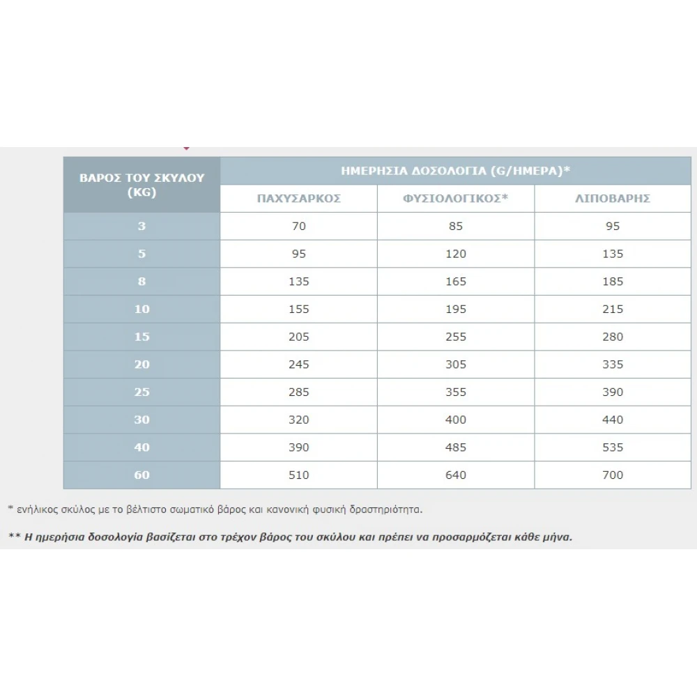 Αφυδατωμένη πρωτεΐνη από χοιρινό και κοτόπουλο, άμυλο πατάτας, ζωικό λίπος, υδρολυμένη πρωτεΐνη από χοιρινό και πουλερικά, φλοιός λαθουριού, μπιζέλια, ιχνοστοιχεία, πολτός τεύτλων, λιναρόσπορος, λιγνοκυτταρίνη, ιχθυέλαιο, ηλιέλαιο, ίνες ψύλλιου (Plantago (L.) spp.), φρουκτο-ολιγοσακχαρίτες, μαγιά ζυθοποιίας, πλακούντες έκθλιψης μποράγκο, Lactobacillus acidophilus, θειική χονδροϊτίνη.