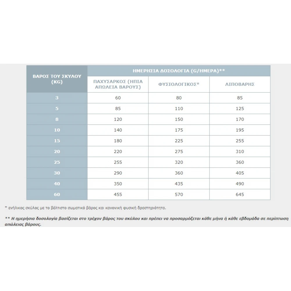Αφυδατωμένη πρωτεΐνη από χοιρινό και κοτόπουλο, ρύζι, φλοιός λαθουριού, υδρολυμένη πρωτεΐνη από χοιρινό και πουλερικά, λιγνοκυτταρίνη, μπιζέλια, λιναρόσπορος, ιχθυέλαιο, άμυλο πατάτας, ζωικό λίπος, ιχνοστοιχεία, φρουκτο-ολιγοσακχαρίτες, ίνες ψύλλιου (Plantago (L.) spp.), μαγιά ζυθοποιίας, πολτός τεύτλων, θειική χονδροϊτίνη, υδρολυμένα καρκινοειδή (πηγή χιτοζάνης), Lactobacillus acidophilus.